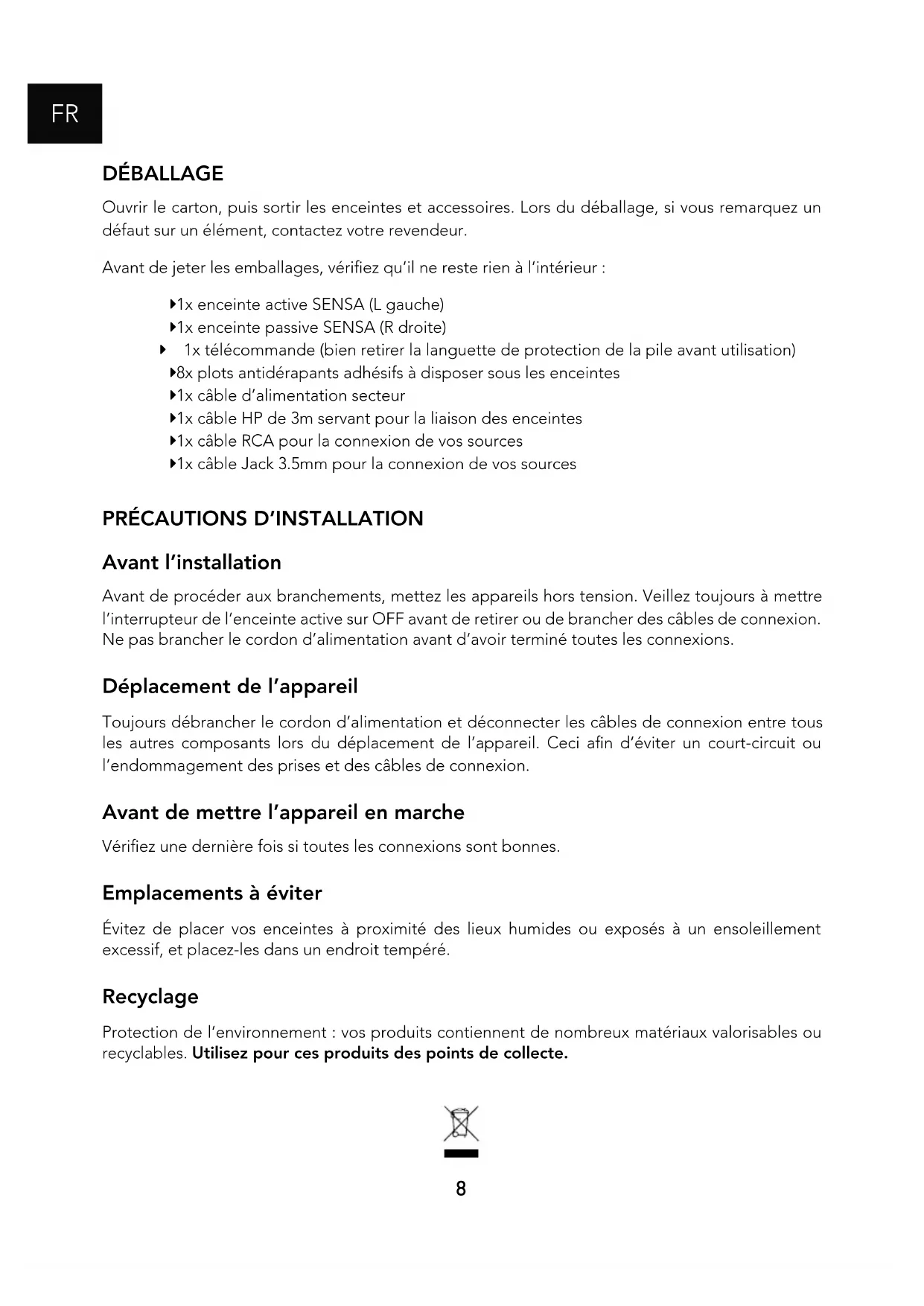 Avant l’installation Avant de procéder aux branchements, mettez les appareils hors tension. Veillez toujours à mettre l’interrupteur de l’enceinte active sur OFF avant de retirer ou de brancher des câbles de connexion. Ne pas brancher le cordon d’alimentation avant d’avoir terminé toutes les connexions. Déplacement de l’appareil Toujours débrancher le cordon d’alimentation et déconnecter les câbles de connexion entre tous les autres composants lors du déplacement de l’appareil. Ceci an d’éviter un court-circuit ou l’endommagement des prises et des câbles de connexion. Avant de mettre l’appareil en marche Vériez une dernière fois si toutes les connexions sont bonnes. Emplacements à éviter Évitez de placer vos enceintes à proximité des lieux humides ou exposés à un ensoleillement excessif, et placez-les dans un endroit tempéré. Recyclage Protection de l’environnement : vos produits contiennent de nombreux matériaux valorisables ou recyclables. Utilisez pour ces produits des points de collecte.9