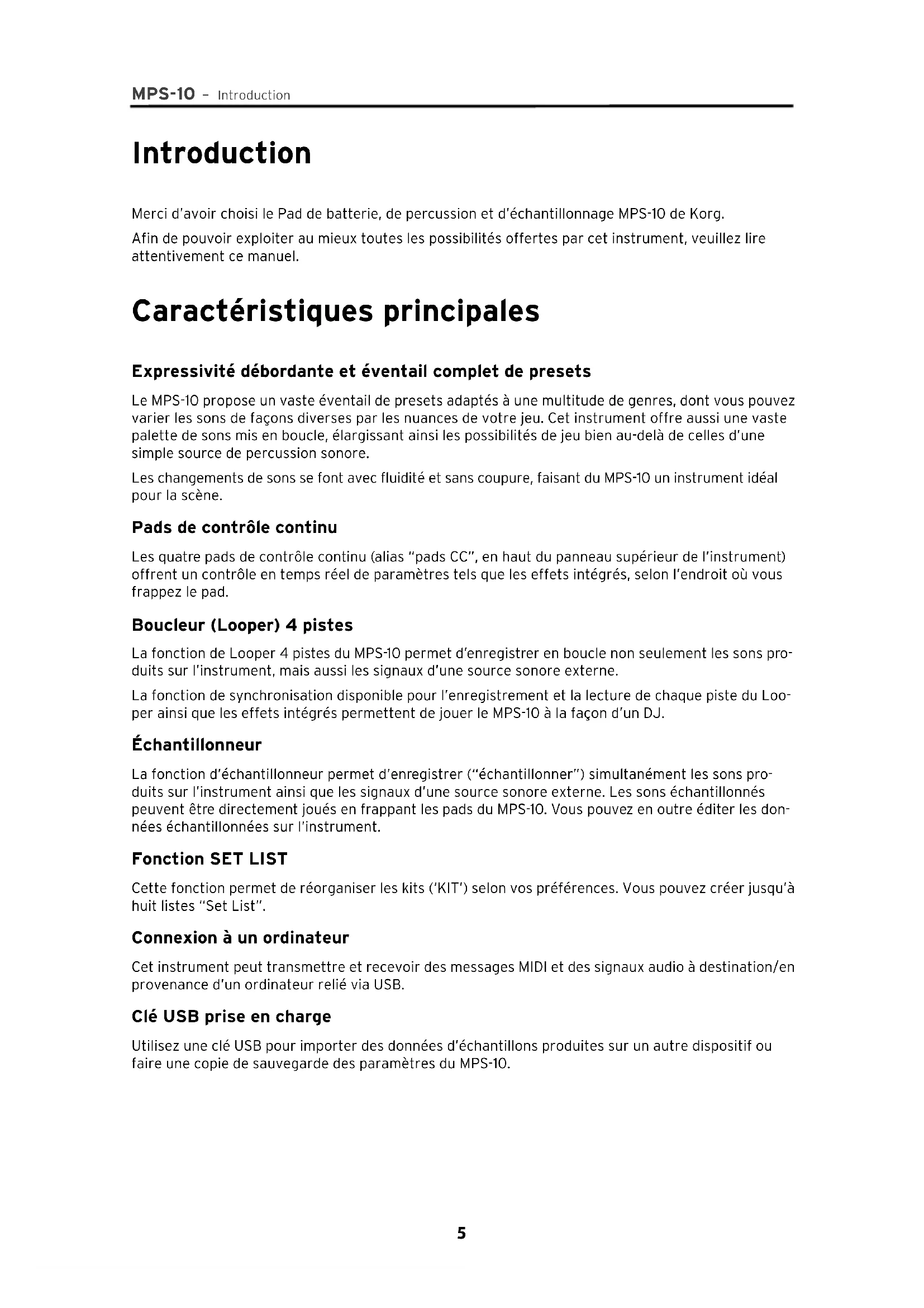 Introduction Merci d’avoir choisi le Pad de batterie, de percussion et d’échantillonnage MPS-10 de Korg. Afin de pouvoir exploiter au mieux toutes les possibilités offertes par cet instrument, veuillez lire attentivement ce manuel. Caractéristiques principales Expressivité débordante et éventail complet de presets Le MPS-10 propose un vaste éventail de presets adaptés à une multitude de genres, dont vous pouvez varier les sons de façons diverses par les nuances de votre jeu. Cet instrument offre aussi une vaste palette de sons mis en boucle, élargissant ainsi les possibilités de jeu bien au-delà de celles d’une simple source de percussion sonore. Les changements de sons se font avec fluidité et sans coupure, faisant du MPS-10 un instrument idéal pour la scène. Pads de contrôle continu Les quatre pads de contrôle continu (alias “pads CC”, en haut du panneau supérieur de l’instrument) offrent un contrôle en temps réel de paramètres tels que les effets intégrés, selon l’endroit où vous frappez le pad. Boucleur (Looper) 4 pistes La fonction de Looper 4 pistes du MPS-10 permet d’enregistrer en boucle non seulement les sons pro- duits sur l’instrument, mais aussi les signaux d’une source sonore externe. La fonction de synchronisation disponible pour l’enregistrement et la lecture de chaque piste du Loo- per ainsi que les effets intégrés permettent de jouer le MPS-10 à la façon d’un DJ. Échantillonneur La fonction d’échantillonneur permet d’enregistrer (“échantillonner”) simultanément les sons pro- duits sur l’instrument ainsi que les signaux d’une source sonore externe. Les sons échantillonnés peuvent être directement joués en frappant les pads du MPS-10. Vous pouvez en outre éditer les don- nées échantillonnées sur l’instrument. Fonction SET LIST Cette fonction permet de réorganiser les kits (‘KIT’) selon vos préférences. Vous pouvez créer jusqu’à huit listes “Set List”. Connexion à un ordinateur Cet instrument peut transmettre et recevoir des messages MIDI et des signaux audio à destination/en provenance d’un ordinateur relié via USB. Clé USB prise en charge Utilisez une clé USB pour importer des données d’échantillons produites sur un autre dispositif ou faire une copie de sauvegarde des paramètres du MPS-10.MPS-10