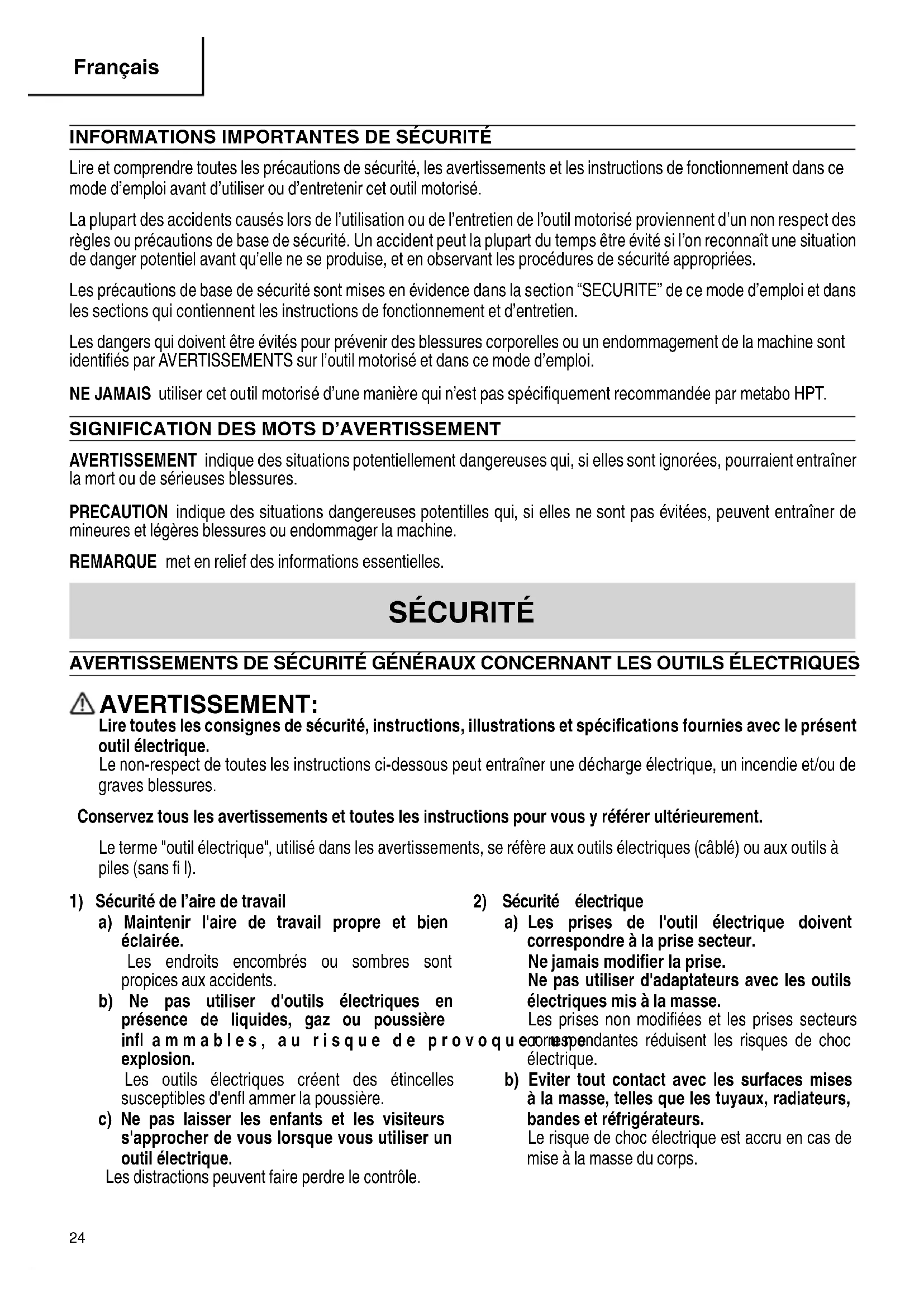 English 000BookDSDV18DCmetabo.indb23000BookDSDV18DCmetabo.indb23 2022/08/0315:44:452022/08/0315:44:45INFORMATIONS IMPORTANTES DE SÉCURITÉ Lire et comprendre toutes les précautions de sécurité, les avertissements et les instructions de fonctionnement dans ce mode d’emploi avant d’utiliser ou d’entretenir cet outil motorisé. La plupart des accidents causés lors de l’utilisation ou de l’entretien de l’outil motorisé proviennent d’un non respect des règles ou précautions de base de sécurité. Un accident peut la plupart du temps être évité si l’on reconnaît une situation de danger potentiel avant qu’elle ne se produise, et en observant les procédures de sécurité appropriées. Les précautions de base de sécurité sont mises en évidence dans la section “SECURITE” de ce mode d’emploi et dans les sections qui contiennent les instructions de fonctionnement et d’entretien. Les dangers qui doivent être évités pour prévenir des blessures corporelles ou un endommagement de la machine sont identifi és par AVERTISSEMENTS sur l’outil motorisé et dans ce mode d’emploi. NE JAMAIS utiliser cet outil motorisé d’une manière qui n’est pas spécifi quement recommandée par metabo HPT.