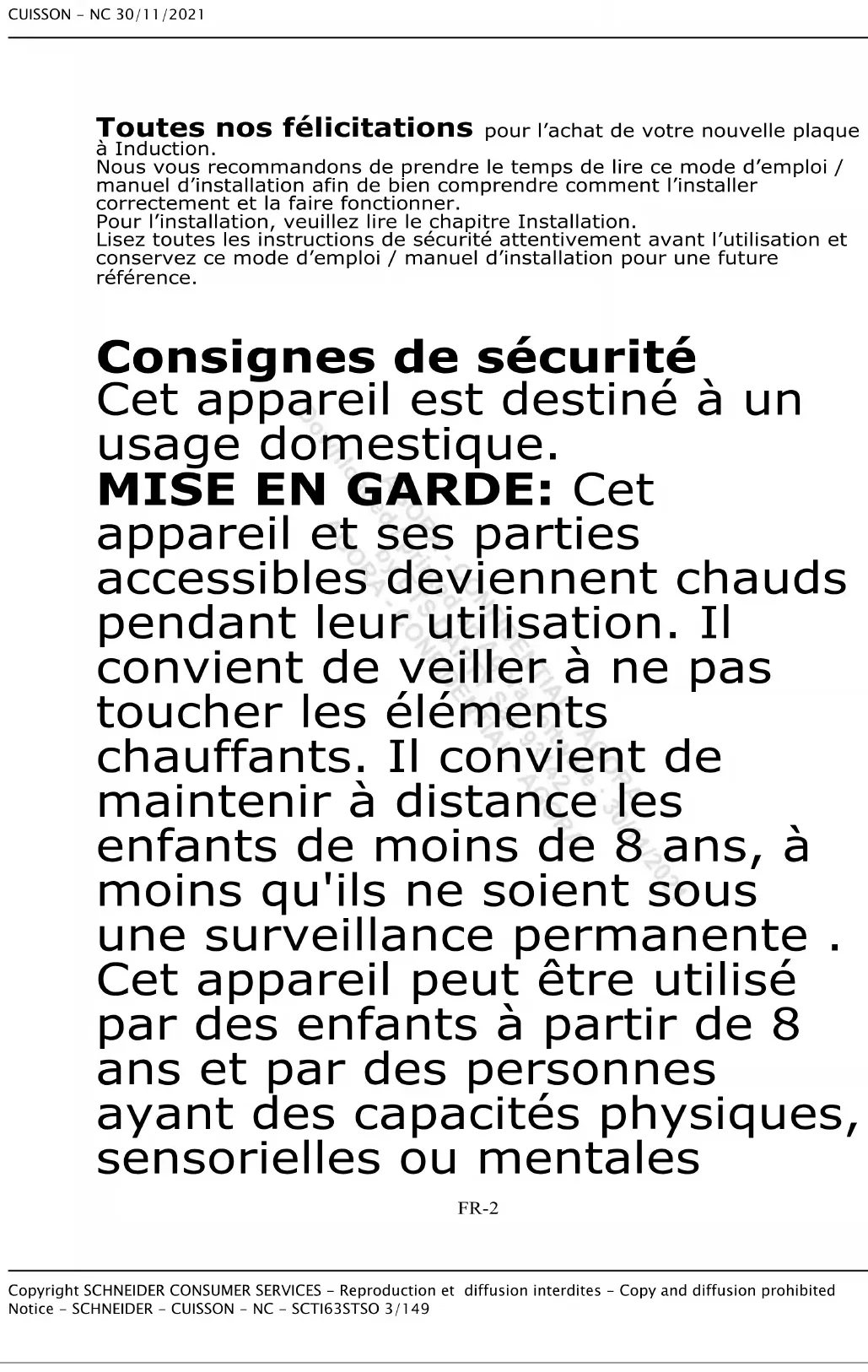 Copyright SCHNEIDER CONSUMER SERVICES - Reproduction et diffusion interdites - Copy and diffusion prohibited Notice - SCHNEIDER - CUISSON - NC - SCTI63STSO 2/149FR-2 Toutes nos félicitations pour l’achat de votre nouvelle plaque à Induction. Nous vous recommandons de prendre le temps de lire ce mode d’emploi / manuel d’installation afin de bien comprendre comment l’installer correctement et la faire fonctionner. Pour l’installation, veuillez lire le chapitre Installation. Lisez toutes les instructions de sécurité attentivement avant l’utilisation et conservez ce mode d’emploi / manuel d’installation pour une future référence. Consignes de sécurité Cet appareil est destiné à un usage domestique. MISE EN GARDE: Cet appareil et ses parties accessibles deviennent chauds pendant leur utilisation. Il convient de veiller à ne pas toucher les éléments chauffants. Il convient de maintenir à distance les enfants de moins de 8 ans, à moins qu'ils ne soient sous une surveillance permanente . Cet appareil peut être utilisé par des enfants à partir de 8 ans et par des personnes ayant des capacités physiques, sensorielles ou mentales