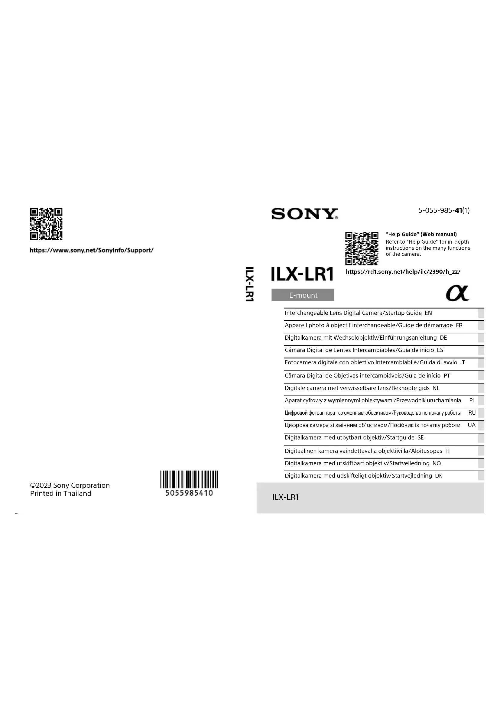À propos du «Guide d’aide» Pour plus d’informations sur l’utilisation de l’appareil photo, consultez le «Guide d’aide» (manuel en ligne).https://rd1.sony.net/help/ilc/2390/h_zz/ILX-LR1 Guide d’aide Français Préparatifs Vérification des éléments fournis Le nombre indiqué entre parenthèses correspond au nombre d’éléments fournis.• Appareil photo (1)• Câble d’alimentation et de contrôle (SONY) (1)• Capuchon de boîtier (1) (fixé à l’appareil photo)• Guide de démarrage (ce manuel) (1)• Guide de référence (1)FR