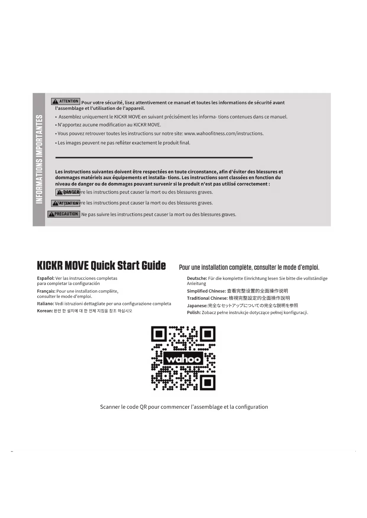 wahootness.com16KICKR MOVE Quick Start Guide Pour une installation complète, consulter le mode d’emploi. Scanner le code QR pour commencer l’assemblage et la conguration INFORMATIONS IMPORTANTES Pour votre sécurité, lisez attentivement ce manuel et toutes les informations de sécurité avant l'assemblage et l'utilisation de l'appareil.