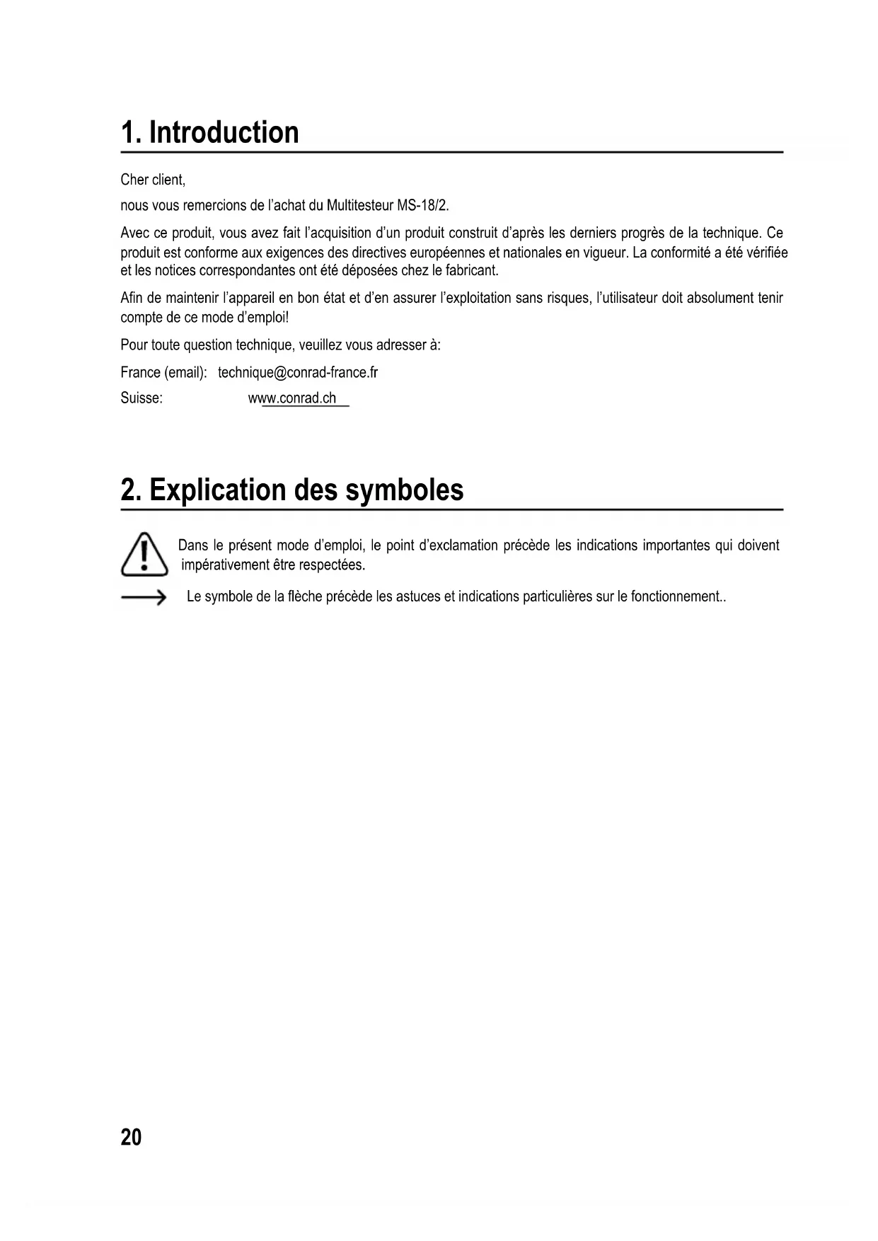 Cher client, nous vous remercions de l’achat du Multitesteur MS-18/2. Avec ce produit, vous avez fait l’acquisition d’un produit construit d’après les derniers progrès de la technique. Ce produitestconformeauxexigencesdesdirectiveseuropéennesetnationalesenvigueur.Laconformitéaétévériée et les notices correspondantes ont été déposées chez le fabricant. Andemaintenirl’appareilenbonétatetd’enassurerl’exploitationsansrisques,l’utilisateurdoitabsolumenttenir compte de ce mode d’emploi! Pour toute question technique, veuillez vous adresser à: France (email): technique@conrad-france.fr Suisse: www.conrad.ch