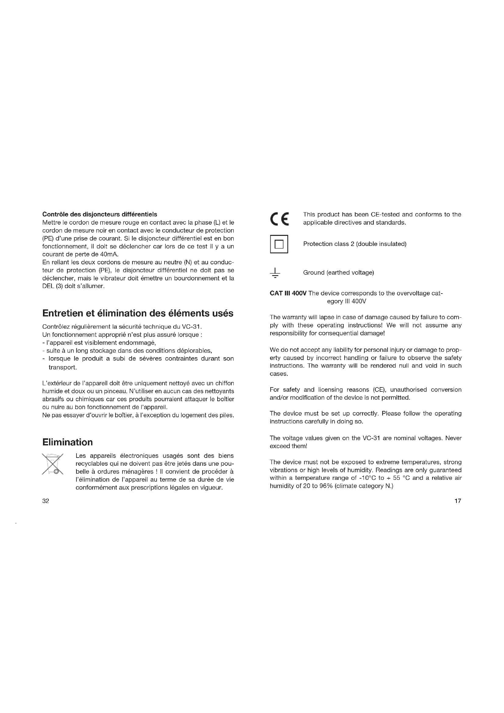 Elimination des accumulateurs usagés Le consommateur est légalement tenu (ordonnance relative à l’éli- mination des piles usagées) de rapporter toutes les piles et tous les accus usagés, il est interdit de les jeter dans les ordures ménagères ! Les piles et accus qui contiennent des substances toxi- ques sont caractérisés par les symboles ci-contre, qui indiquent l’interdiction de les jeter dans les ordures ménagères. Les désignations pour le métal lourd prépondérant sont : Cd = cadmium, Hg = mercure, Pb = plomb. Vous pouvez rapporter gratuitement vos piles et accus usagés aux centres de récupération de votre commune, à nos succursales ou à tous les points de vente de piles et d’accus. Caractéristiques techniques Alimentation électrique : Pile bloc de 9 V (IEC6F22) Contrôle de continuité : 0 à 10kΩ (± 3kΩ) Contrôle de tension CA/CC : 400V max. Contrôle de polarité CC : 1,5 à 400 V/CC Courant de perte (ELSB) : < 40mA / 230V Durée de décharge : env. 1,5 sec. Fréquence du vibrateur : 0 - 20kHz Catégorie de surtension : CATIII / 400V Longueur des cordons de mesure : 80 cm Dimensions : 105 x 70 x 39 mm 33Contrôle des disjoncteurs différentiels Mettre le cordon de mesure rouge en contact avec la phase (L) et le cordon de mesure noir en contact avec le conducteur de protection (PE) d’une prise de courant. Si le disjoncteur différentiel est en bon fonctionnement, il doit se déclencher car lors de ce test il y a un courant de perte de 40mA. En reliant les deux cordons de mesure au neutre (N) et au conduc- teur de protection (PE), le disjoncteur différentiel ne doit pas se déclencher, mais le vibrateur doit émettre un bourdonnement et la DEL (3) doit s’allumer. Entretien et élimination des éléments usés Contrôlez régulièrement la sécurité technique du VC-31. Un fonctionnement approprié n’est plus assuré lorsque : - l’appareil est visiblement endommagé, - suite à un long stockage dans des conditions déplorables,