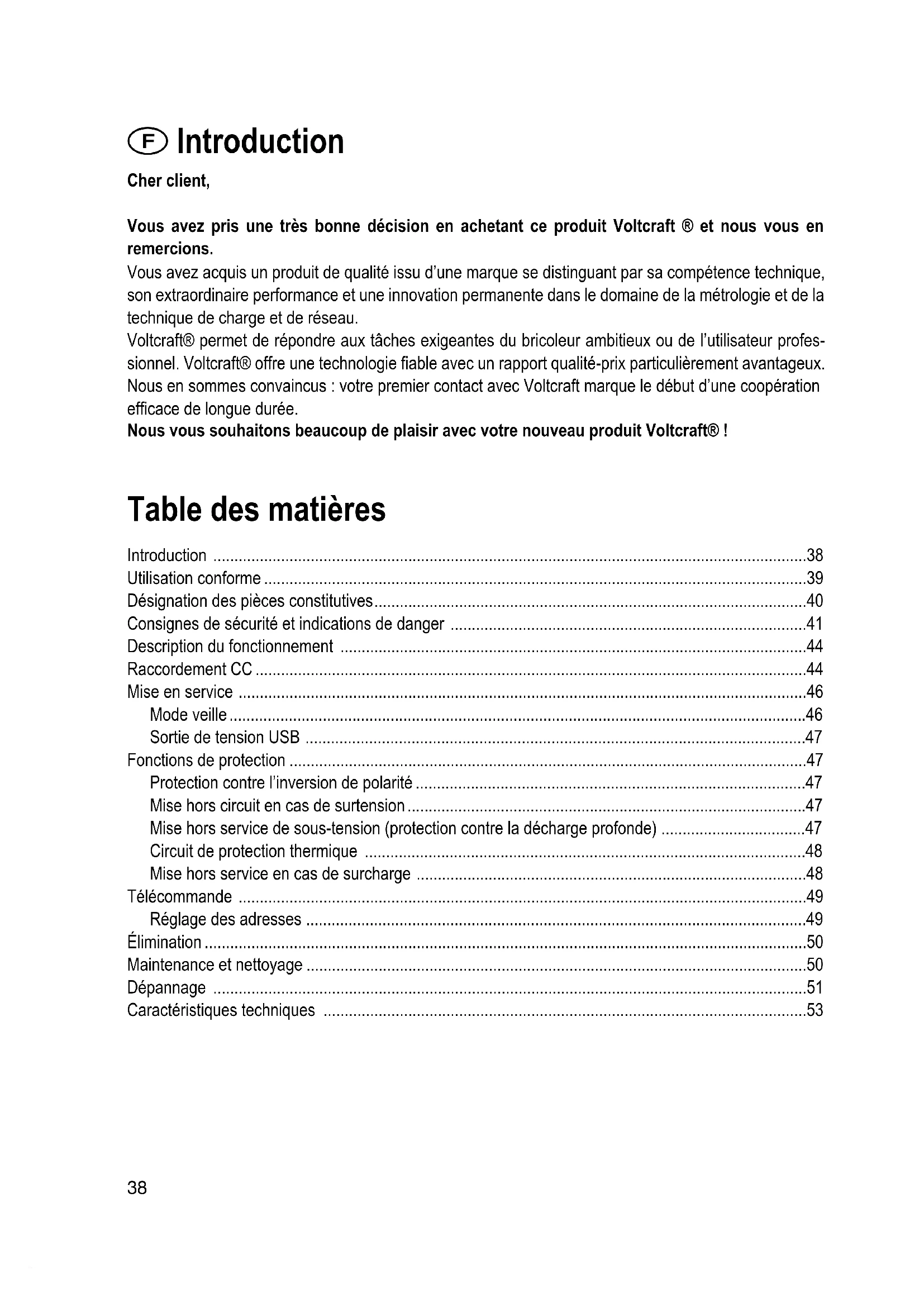 - Introduction Cher client, Vous avez pris une très bonne décision en achetant ce produit Voltcraft ® et nous vous en remercions. Vous avez acquis un produit de qualité issu d’une marque se distinguant par sa compétence technique, son extraordinaire performance et une innovation permanente dans le domaine de la métrologie et de la technique de charge et de réseau. Voltcraft® permet de répondre aux tâches exigeantes du bricoleur ambitieux ou de l’utilisateur profes- sionnel. Voltcraft® offre une technologie fiable avec un rapport qualité-prix particulièrement avantageux. Nous en sommes convaincus : votre premier contact avec Voltcraft marque le début d’une coopération efficace de longue durée. Nous vous souhaitons beaucoup de plaisir avec votre nouveau produit Voltcraft® ! Table des matières Introduction p. 38