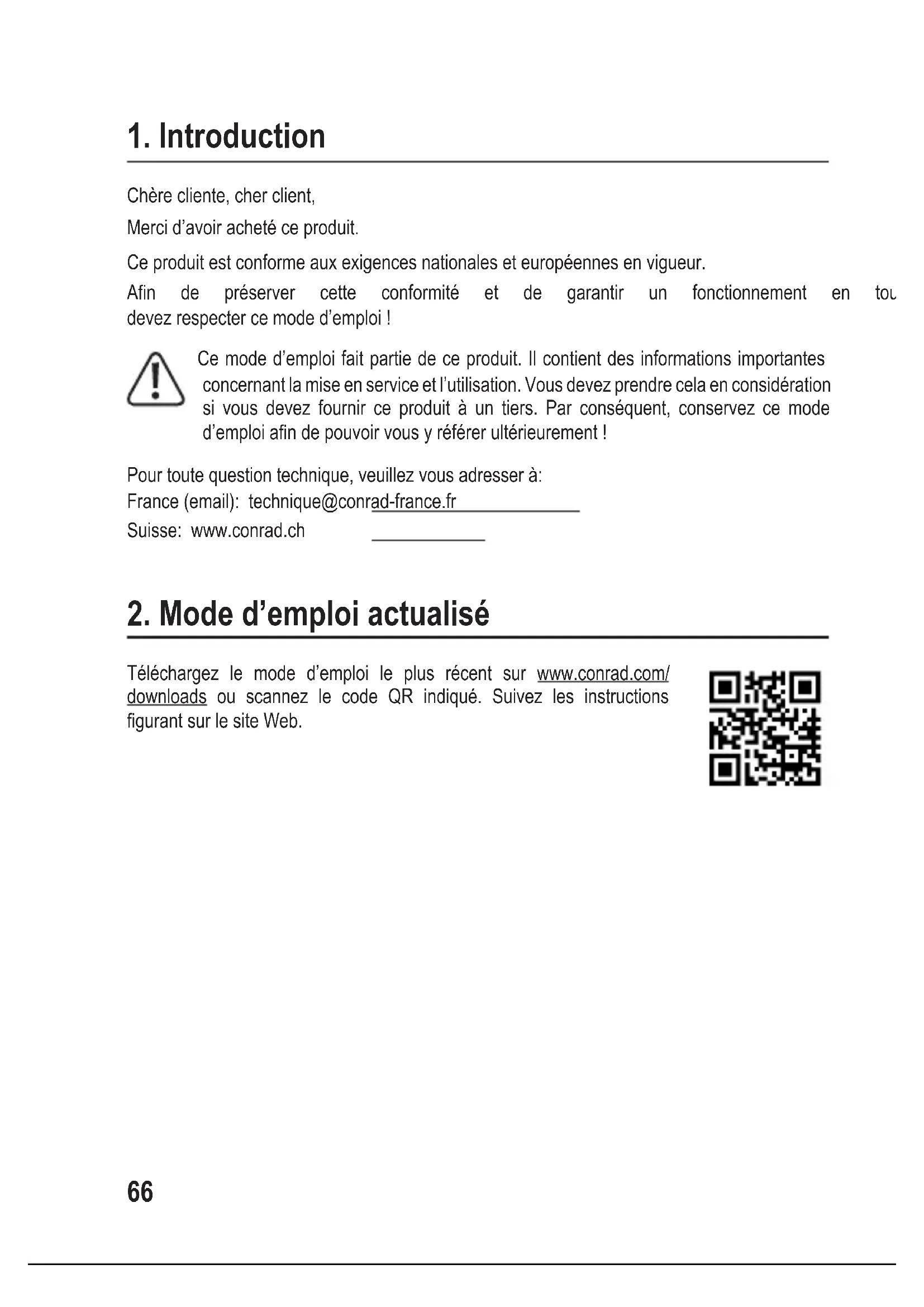 Chère cliente, cher client, Merci d’avoir acheté ce produit. Ce produit est conforme aux exigences nationales et européennes en vigueur. An de préserver cette conformité et de garantir un fonctionnement en toute sécurité, vous devez respecter ce mode d’emploi ! Ce mode d’emploi fait partie de ce produit. Il contient des informations importantes concernant la mise en service et l’utilisation. Vous devez prendre cela en considération si vous devez fournir ce produit à un tiers. Par conséquent, conservez ce mode d’emploiandepouvoirvousyréférerultérieurement! Pour toute question technique, veuillez vous adresser à: France (email): technique@conrad-france.fr Suisse: www.conrad.ch