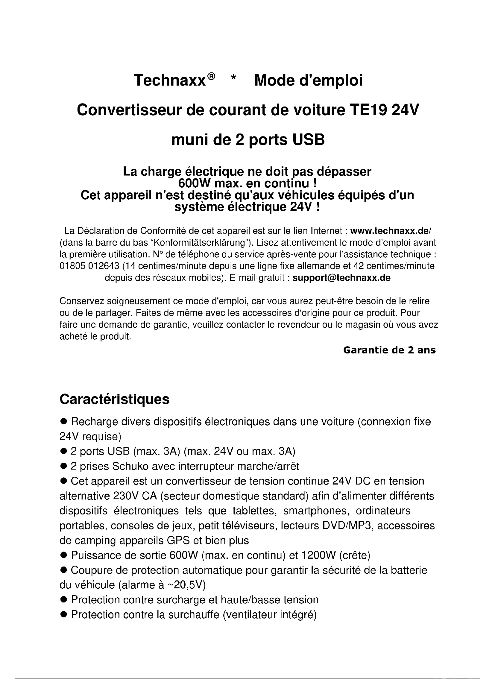 - Mode d'emploi Convertisseur de courant de voiture TE19 24V muni de 2 ports USB La charge électrique ne doit pas dépasser 600W max. en continu ! Cet appareil n'est destiné qu'aux véhicules équipés d'un système électrique 24V ! La Déclaration de Conformité de cet appareil est sur le lien Internet : www.technaxx.de/ (dans la barre du bas “Konformitätserklärung”). Lisez attentivement le mode d’emploi avant la première utilisation. N° de téléphone du service après-vente pour l’assistance technique : 01805 012643 (14 centimes/minute depuis une ligne fixe allemande et 42 centimes/minute depuis des réseaux mobiles). E-mail gratuit : support@technaxx.de Conservez soigneusement ce mode d'emploi, car vous aurez peut-être besoin de le relire ou de le partager. Faites de même avec les accessoires d’origine pour ce produit. Pour faire une demande de garantie, veuillez contacter le revendeur ou le magasin où vous avez acheté le produit. Garantie de 2 ans