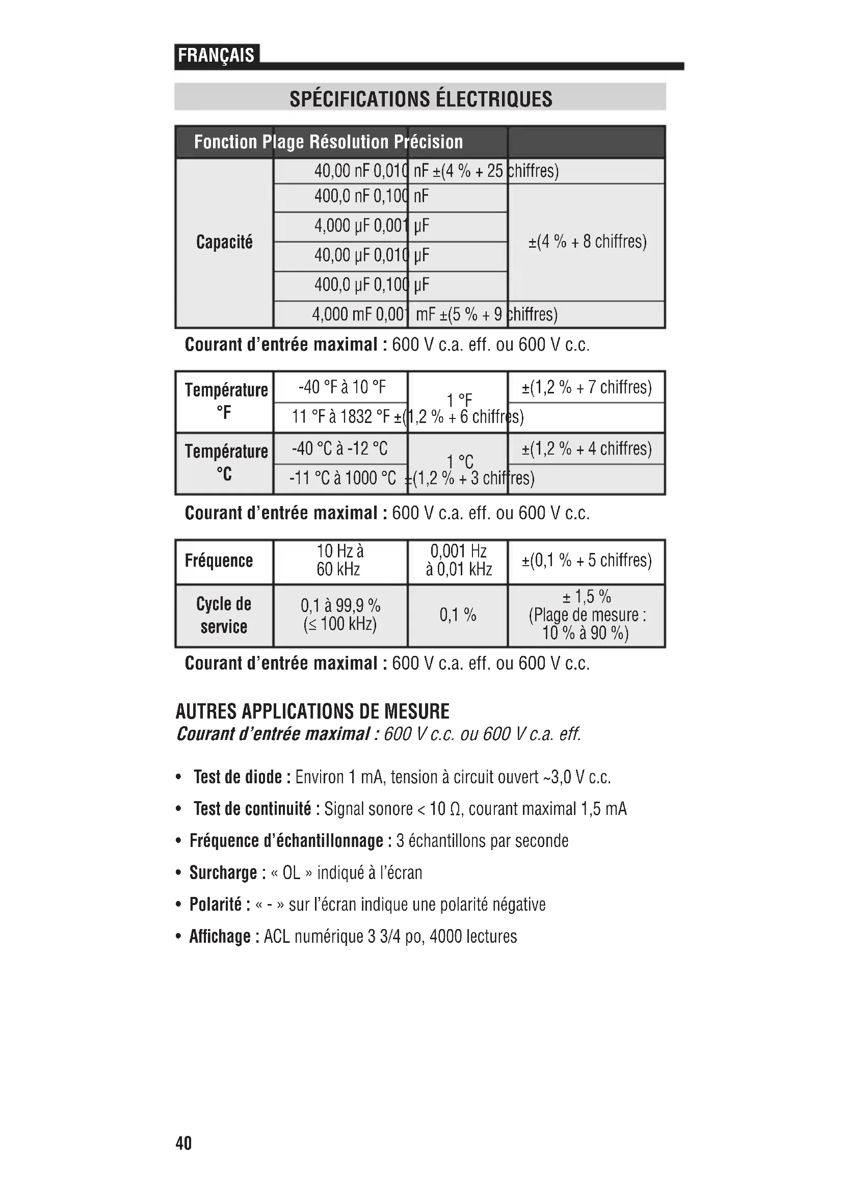 - Précision: ± (% de la lecture + nombre de chiffres les moinssignificatifs)
