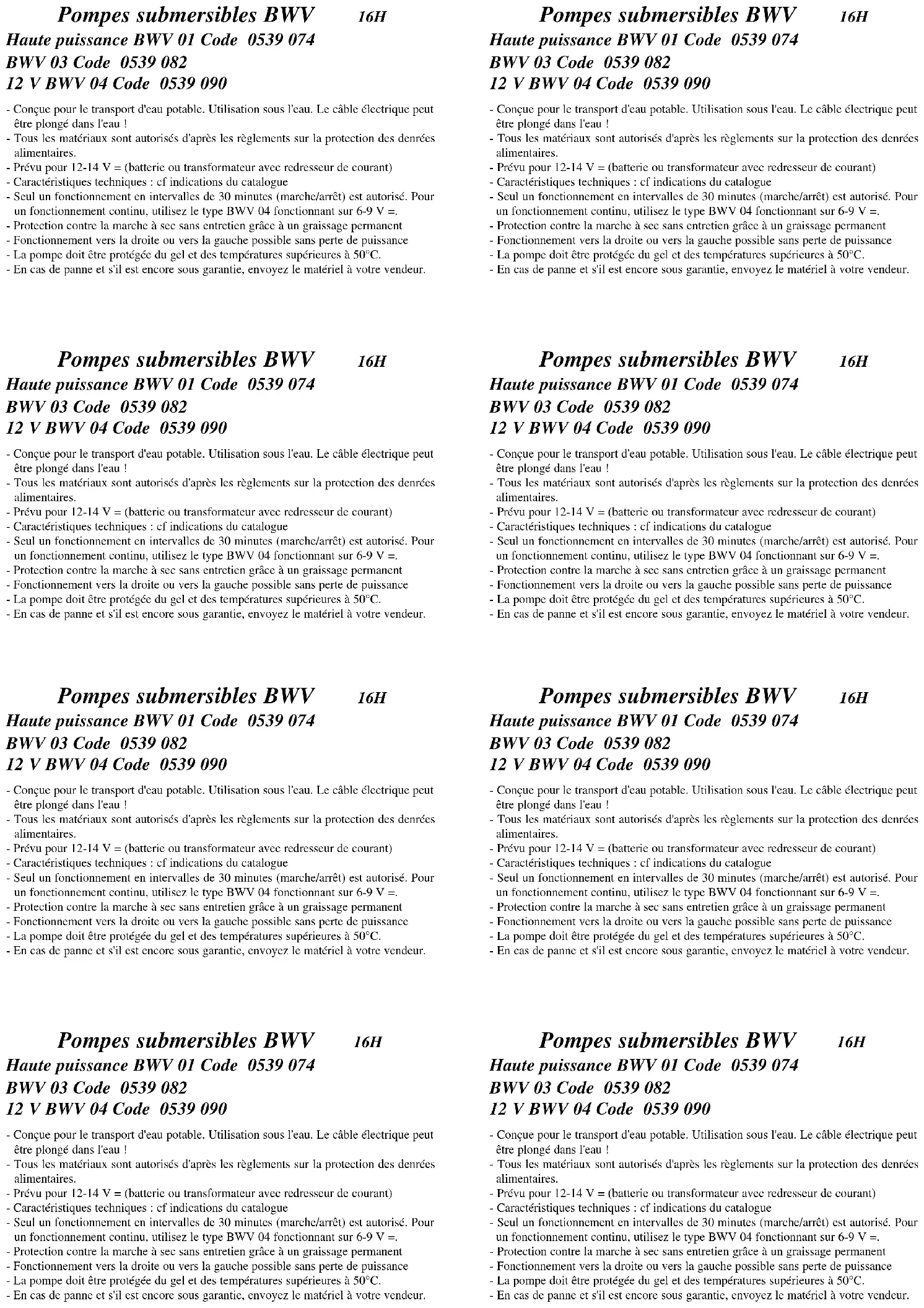 Pompes submersibles BWV 16H Haute puissance BWV 01 Code 0539 074 BWV 03 Code 0539 082 12 V BWV 04 Code 0539 090 - Conçue pour le transport d'eau potable. Utilisation sous l'eau. Le câble électrique peut être plongé dans l'eau ! - Tous les matériaux sont autorisés d'après les règlements sur la protection des denrées alimentaires. - Prévu pour 12-14 V = (batterie ou transformateur avec redresseur de courant) - Caractéristiques techniques : cf indications du catalogue - Seul un fonctionnement en intervalles de 30 minutes (marche/arrêt) est autorisé. Pour un fonctionnement continu, utilisez le type BWV 04 fonctionnant sur 6-9 V =. - Protection contre la marche à sec sans entretien grâce à un graissage permanent - Fonctionnement vers la droite ou vers la gauche possible sans perte de puissance - La pompe doit être protégée du gel et des températures supérieures à 50°C. - En cas de panne et s'il est encore sous garantie, envoyez le matériel à votre vendeur. Pompes submersibles BWV 16H Haute puissance BWV 01 Code 0539 074 BWV 03 Code 0539 082 12 V BWV 04 Code 0539 090 - Conçue pour le transport d'eau potable. Utilisation sous l'eau. Le câble électrique peut être plongé dans l'eau ! - Tous les matériaux sont autorisés d'après les règlements sur la protection des denrées alimentaires. - Prévu pour 12-14 V = (batterie ou transformateur avec redresseur de courant) - Caractéristiques techniques : cf indications du catalogue - Seul un fonctionnement en intervalles de 30 minutes (marche/arrêt) est autorisé. Pour un fonctionnement continu, utilisez le type BWV 04 fonctionnant sur 6-9 V =. - Protection contre la marche à sec sans entretien grâce à un graissage permanent - Fonctionnement vers la droite ou vers la gauche possible sans perte de puissance - La pompe doit être protégée du gel et des températures supérieures à 50°C. - En cas de panne et s'il est encore sous garantie, envoyez le matériel à votre vendeur. Pompes submersibles BWV 16H Haute puissance BWV 01 Code 0539 074 BWV 03 Code 0539 082 12 V BWV 04 Code 0539 090 - Conçue pour le transport d'eau potable. Utilisation sous l'eau. Le câble électrique peut être plongé dans l'eau ! - Tous les matériaux sont autorisés d'après les règlements sur la protection des denrées alimentaires. - Prévu pour 12-14 V = (batterie ou transformateur avec redresseur de courant) - Caractéristiques techniques : cf indications du catalogue - Seul un fonctionnement en intervalles de 30 minutes (marche/arrêt) est autorisé. Pour un fonctionnement continu, utilisez le type BWV 04 fonctionnant sur 6-9 V =. - Protection contre la marche à sec sans entretien grâce à un graissage permanent - Fonctionnement vers la droite ou vers la gauche possible sans perte de puissance - La pompe doit être protégée du gel et des températures supérieures à 50°C. - En cas de panne et s'il est encore sous garantie, envoyez le matériel à votre vendeur. Pompes submersibles BWV 16H Haute puissance BWV 01 Code 0539 074 BWV 03 Code 0539 082 12 V BWV 04 Code 0539 090 - Conçue pour le transport d'eau potable. Utilisation sous l'eau. Le câble électrique peut être plongé dans l'eau ! - Tous les matériaux sont autorisés d'après les règlements sur la protection des denrées alimentaires. - Prévu pour 12-14 V = (batterie ou transformateur avec redresseur de courant) - Caractéristiques techniques : cf indications du catalogue - Seul un fonctionnement en intervalles de 30 minutes (marche/arrêt) est autorisé. Pour un fonctionnement continu, utilisez le type BWV 04 fonctionnant sur 6-9 V =. - Protection contre la marche à sec sans entretien grâce à un graissage permanent - Fonctionnement vers la droite ou vers la gauche possible sans perte de puissance - La pompe doit être protégée du gel et des températures supérieures à 50°C. - En cas de panne et s'il est encore sous garantie, envoyez le matériel à votre vendeur. Pompes submersibles BWV 16H Haute puissance BWV 01 Code 0539 074 BWV 03 Code 0539 082 12 V BWV 04 Code 0539 090 - Conçue pour le transport d'eau potable. Utilisation sous l'eau. Le câble électrique peut être plongé dans l'eau ! - Tous les matériaux sont autorisés d'après les règlements sur la protection des denrées alimentaires. - Prévu pour 12-14 V = (batterie ou transformateur avec redresseur de courant) - Caractéristiques techniques : cf indications du catalogue - Seul un fonctionnement en intervalles de 30 minutes (marche/arrêt) est autorisé. Pour un fonctionnement continu, utilisez le type BWV 04 fonctionnant sur 6-9 V =. - Protection contre la marche à sec sans entretien grâce à un graissage permanent - Fonctionnement vers la droite ou vers la gauche possible sans perte de puissance - La pompe doit être protégée du gel et des températures supérieures à 50°C. - En cas de panne et s'il est encore sous garantie, envoyez le matériel à votre vendeur. Pompes submersibles BWV 16H Haute puissance BWV 01 Code 0539 074 BWV 03 Code 0539 082 12 V BWV 04 Code 0539 090 - Conçue pour le transport d'eau potable. Utilisation sous l'eau. Le câble électrique peut être plongé dans l'eau ! - Tous les matériaux sont autorisés d'après les règlements sur la protection des denrées alimentaires. - Prévu pour 12-14 V = (batterie ou transformateur avec redresseur de courant) - Caractéristiques techniques : cf indications du catalogue - Seul un fonctionnement en intervalles de 30 minutes (marche/arrêt) est autorisé. Pour un fonctionnement continu, utilisez le type BWV 04 fonctionnant sur 6-9 V =. - Protection contre la marche à sec sans entretien grâce à un graissage permanent - Fonctionnement vers la droite ou vers la gauche possible sans perte de puissance - La pompe doit être protégée du gel et des températures supérieures à 50°C. - En cas de panne et s'il est encore sous garantie, envoyez le matériel à votre vendeur. Pompes submersibles BWV 16H Haute puissance BWV 