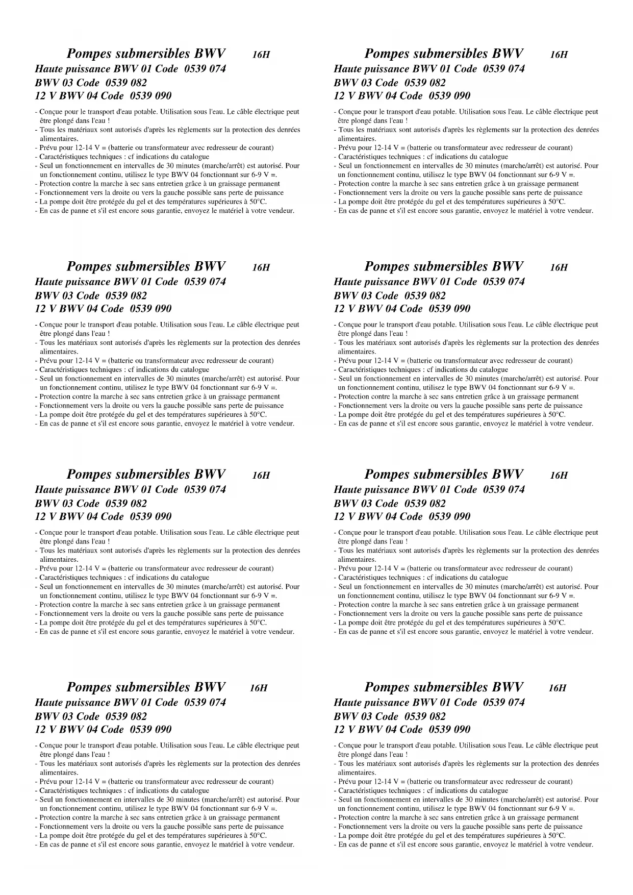 Pompes submersibles BWV 16H Haute puissance BWV 01 Code 0539 074 BWV 03 Code 0539 082 12 V BWV 04 Code 0539 090 - Conçue pour le transport d'eau potable. Utilisation sous l'eau. Le câble électrique peut être plongé dans l'eau ! - Tous les matériaux sont autorisés d'après les règlements sur la protection des denrées alimentaires. - Prévu pour 12-14 V = (batterie ou transformateur avec redresseur de courant) - Caractéristiques techniques : cf indications du catalogue - Seul un fonctionnement en intervalles de 30 minutes (marche/arrêt) est autorisé. Pour un fonctionnement continu, utilisez le type BWV 04 fonctionnant sur 6-9 V =. - Protection contre la marche à sec sans entretien grâce à un graissage permanent - Fonctionnement vers la droite ou vers la gauche possible sans perte de puissance - La pompe doit être protégée du gel et des températures supérieures à 50°C. - En cas de panne et s'il est encore sous garantie, envoyez le matériel à votre vendeur. Pompes submersibles BWV 16H Haute puissance BWV 01 Code 0539 074 BWV 03 Code 0539 082 12 V BWV 04 Code 0539 090 - Conçue pour le transport d'eau potable. Utilisation sous l'eau. Le câble électrique peut être plongé dans l'eau ! - Tous les matériaux sont autorisés d'après les règlements sur la protection des denrées alimentaires. - Prévu pour 12-14 V = (batterie ou transformateur avec redresseur de courant) - Caractéristiques techniques : cf indications du catalogue - Seul un fonctionnement en intervalles de 30 minutes (marche/arrêt) est autorisé. Pour un fonctionnement continu, utilisez le type BWV 04 fonctionnant sur 6-9 V =. - Protection contre la marche à sec sans entretien grâce à un graissage permanent - Fonctionnement vers la droite ou vers la gauche possible sans perte de puissance - La pompe doit être protégée du gel et des températures supérieures à 50°C. - En cas de panne et s'il est encore sous garantie, envoyez le matériel à votre vendeur. Pompes submersibles BWV 16H Haute puissance BWV 01 Code 0539 074 BWV 03 Code 0539 082 12 V BWV 04 Code 0539 090 - Conçue pour le transport d'eau potable. Utilisation sous l'eau. Le câble électrique peut être plongé dans l'eau ! - Tous les matériaux sont autorisés d'après les règlements sur la protection des denrées alimentaires. - Prévu pour 12-14 V = (batterie ou transformateur avec redresseur de courant) - Caractéristiques techniques : cf indications du catalogue - Seul un fonctionnement en intervalles de 30 minutes (marche/arrêt) est autorisé. Pour un fonctionnement continu, utilisez le type BWV 04 fonctionnant sur 6-9 V =. - Protection contre la marche à sec sans entretien grâce à un graissage permanent - Fonctionnement vers la droite ou vers la gauche possible sans perte de puissance - La pompe doit être protégée du gel et des températures supérieures à 50°C. - En cas de panne et s'il est encore sous garantie, envoyez le matériel à votre vendeur. Pompes submersibles BWV 16H Haute puissance BWV 01 Code 0539 074 BWV 03 Code 0539 082 12 V BWV 04 Code 0539 090 - Conçue pour le transport d'eau potable. Utilisation sous l'eau. Le câble électrique peut être plongé dans l'eau ! - Tous les matériaux sont autorisés d'après les règlements sur la protection des denrées alimentaires. - Prévu pour 12-14 V = (batterie ou transformateur avec redresseur de courant) - Caractéristiques techniques : cf indications du catalogue - Seul un fonctionnement en intervalles de 30 minutes (marche/arrêt) est autorisé. Pour un fonctionnement continu, utilisez le type BWV 04 fonctionnant sur 6-9 V =. - Protection contre la marche à sec sans entretien grâce à un graissage permanent - Fonctionnement vers la droite ou vers la gauche possible sans perte de puissance - La pompe doit être protégée du gel et des températures supérieures à 50°C. - En cas de panne et s'il est encore sous garantie, envoyez le matériel à votre vendeur. Pompes submersibles BWV 16H Haute puissance BWV 01 Code 0539 074 BWV 03 Code 0539 082 12 V BWV 04 Code 0539 090 - Conçue pour le transport d'eau potable. Utilisation sous l'eau. Le câble électrique peut être plongé dans l'eau ! - Tous les matériaux sont autorisés d'après les règlements sur la protection des denrées alimentaires. - Prévu pour 12-14 V = (batterie ou transformateur avec redresseur de courant) - Caractéristiques techniques : cf indications du catalogue - Seul un fonctionnement en intervalles de 30 minutes (marche/arrêt) est autorisé. Pour un fonctionnement continu, utilisez le type BWV 04 fonctionnant sur 6-9 V =. - Protection contre la marche à sec sans entretien grâce à un graissage permanent - Fonctionnement vers la droite ou vers la gauche possible sans perte de puissance - La pompe doit être protégée du gel et des températures supérieures à 50°C. - En cas de panne et s'il est encore sous garantie, envoyez le matériel à votre vendeur. Pompes submersibles BWV 16H Haute puissance BWV 01 Code 0539 074 BWV 03 Code 0539 082 12 V BWV 04 Code 0539 090 - Conçue pour le transport d'eau potable. Utilisation sous l'eau. Le câble électrique peut être plongé dans l'eau ! - Tous les matériaux sont autorisés d'après les règlements sur la protection des denrées alimentaires. - Prévu pour 12-14 V = (batterie ou transformateur avec redresseur de courant) - Caractéristiques techniques : cf indications du catalogue - Seul un fonctionnement en intervalles de 30 minutes (marche/arrêt) est autorisé. Pour un fonctionnement continu, utilisez le type BWV 04 fonctionnant sur 6-9 V =. - Protection contre la marche à sec sans entretien grâce à un graissage permanent - Fonctionnement vers la droite ou vers la gauche possible sans perte de puissance - La pompe doit être protégée du gel et des températures supérieures à 50°C. - En cas de panne et s'il est encore sous garantie, envoyez le matériel à votre vendeur. Pompes submersibles BWV 16H Haute puissance BWV 