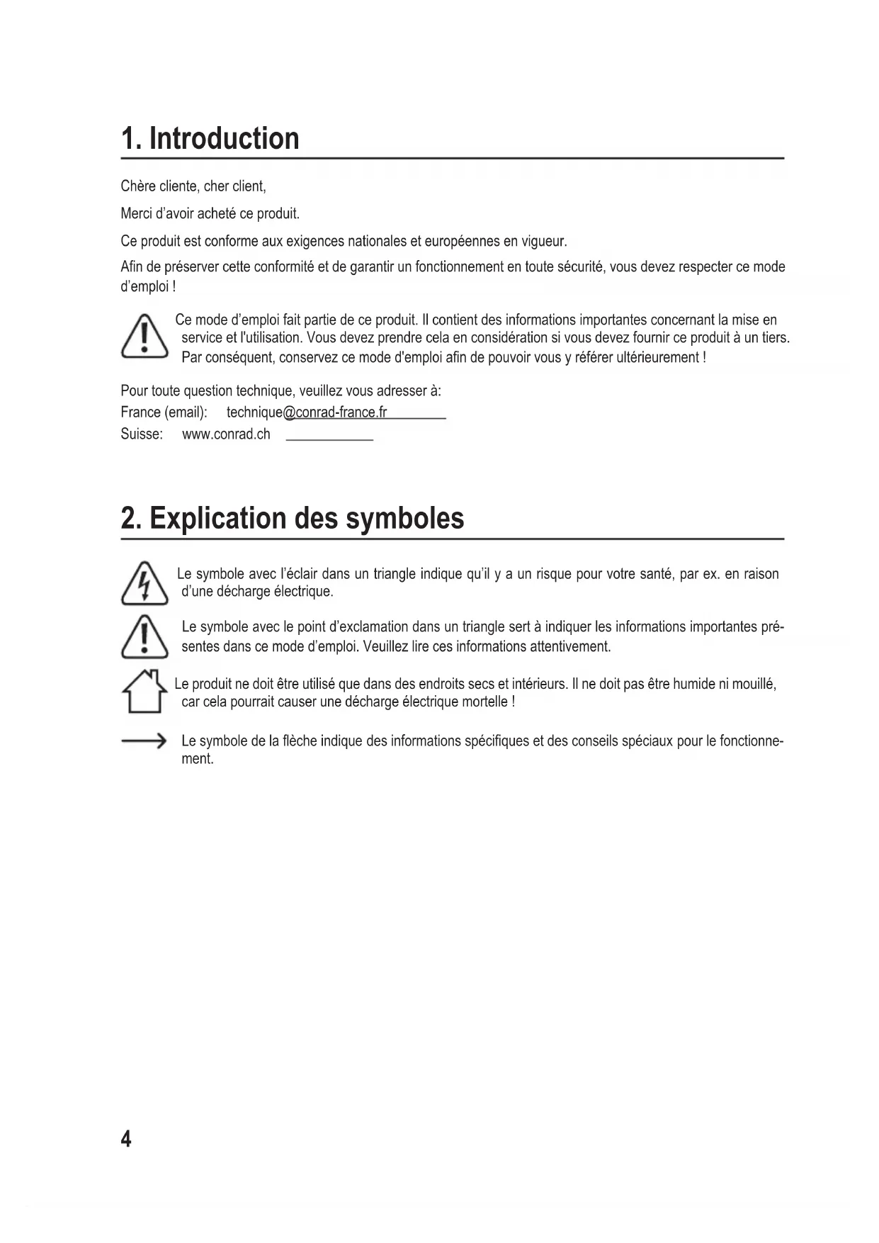 Chère cliente, cher client, Merci d’avoir acheté ce produit. Ce produit est conforme aux exigences nationales et européennes en vigueur. Andepréservercetteconformitéetdegarantirunfonctionnemententoutesécurité,vousdevezrespectercemode d’emploi ! Ce mode d’emploi fait partie de ce produit. Il contient des informations importantes concernant la mise en serviceetl'utilisation.Vousdevezprendrecelaenconsidérationsivousdevezfournirceproduitàuntiers. Parconséquent,conservezcemoded'emploiandepouvoirvousyréférerultérieurement! Pourtoutequestiontechnique,veuillezvousadresserà: France(email): technique@conrad-france.fr Suisse: www.conrad.ch