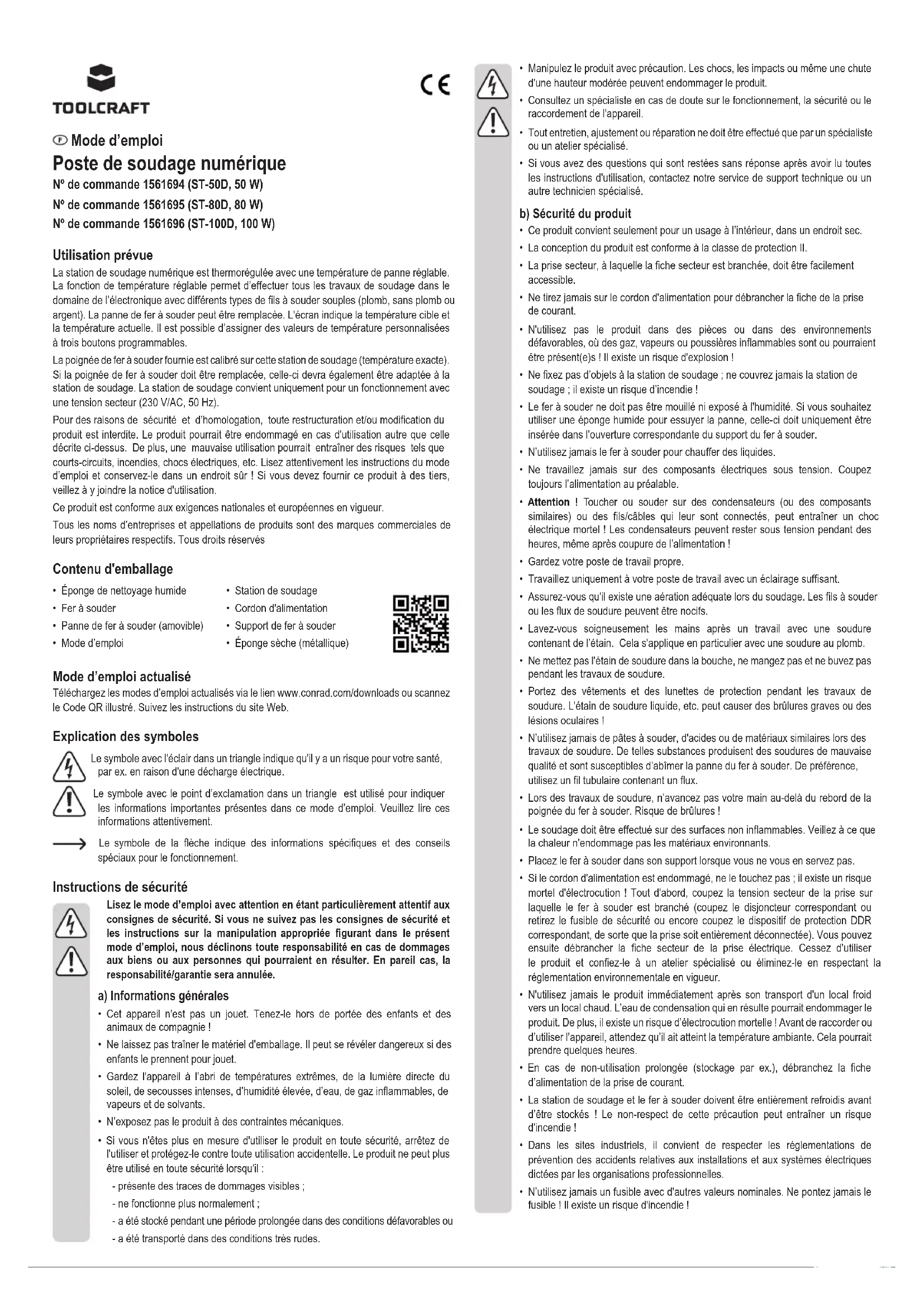 nominales identiques (voir « Données techniques »). Si le fusible saute à nouveau après l’allumage de la station de soudage, éteignez la station de soudage et débranchez le cordon d'alimentation de la prise de courant. Cessez d’utiliser la station de soudage et faites-la contrôler par un spécialiste. Recyclage Les appareils électroniques sont des matériaux recyclables et ne doivent pas être éliminés avec les ordures ménagères. En n de vie, éliminez l’appareil conformément aux dispositions légales en vigueur. Ainsi, vous respectez les ordonnances légales et contribuez à la protection de l’environnement. Données techniques Type de station de soudage ST-50D ST-80D ST-100D Nº de commande 1561694 1561695 1561696 Tension de fonctionnement 230 V/AC, 50 Hz Alimentation électrique max. 65 W max. 100 W max. 118 W Tension de fer à souder 24 V/AC Puissance de fer à souder 50 W 80 W 100 W Température de la panne à souder 150 °C à 450 °C (ajustable) Temps de chauffage (25 °C à 450 °C) 120 s 80 s 60 s Prise d'égalisation de potentiel / ESD connecteur de diamètre (Ø 4 mm) Type de sécurité 5 x 20 mm Valeurs de fusible 250 V, 400 mA, temporisé 250 V, 630 mA, temporisé 250 V, 630 mA, temporisé Poids de la station de soudage 1.750 g 2.030 g 2.350 g Longueur du cordon de la fer à souder env. 100 cm Dimensions de la station de soudage (P x H x l) 122 x 99 x 178 mm Dimensions du support de fer à souder (P x H x l) 71 x 85 x 158 mm• Behandel het product met zorg. Schokken, botsingen of zelfs een val van beperkte hoogte kunnen het product beschadigen.