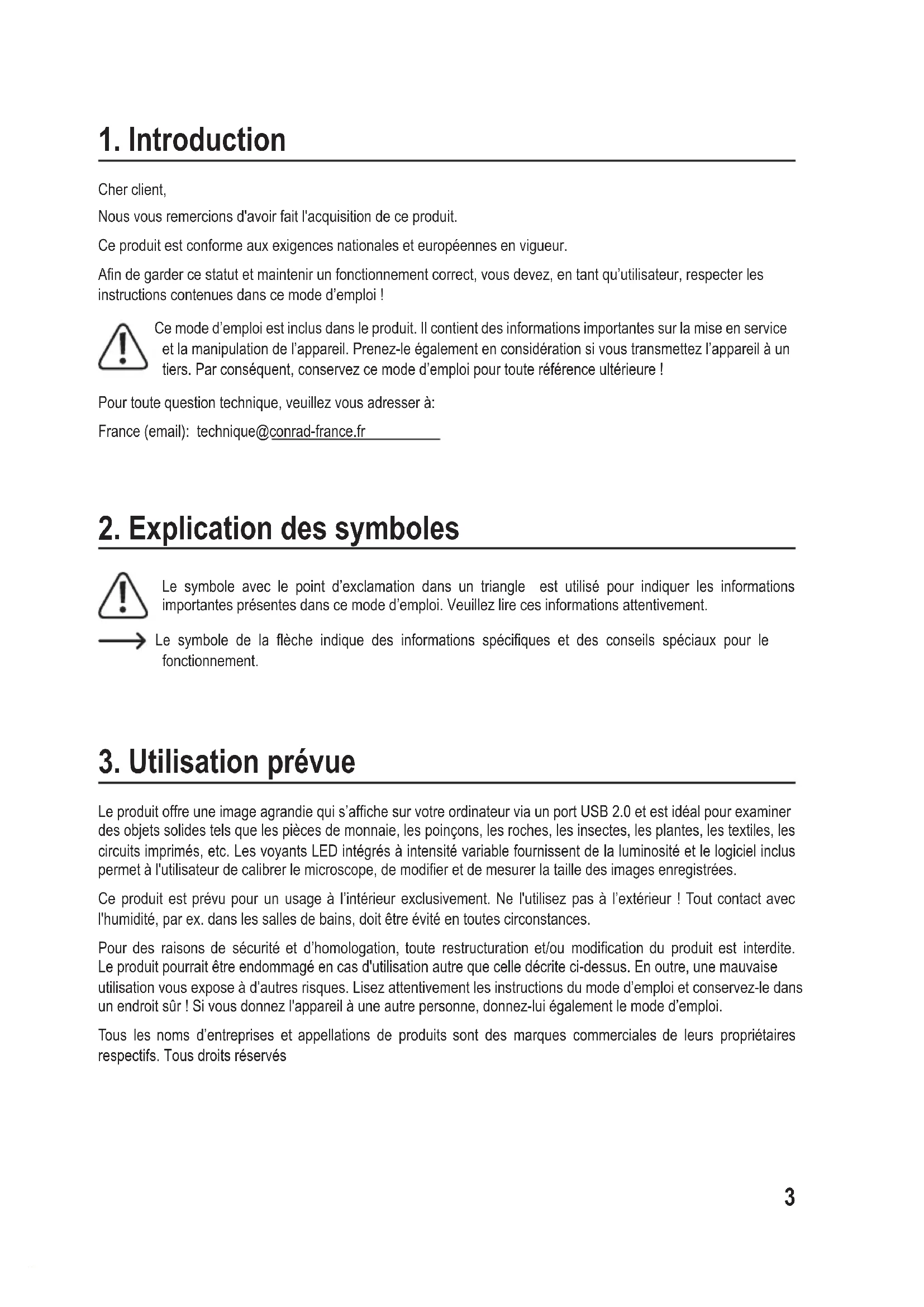 Cher client, Nous vous remercions d'avoir fait l'acquisition de ce produit. Ce produit est conforme aux exigences nationales et européennes en vigueur. An de garder ce statut et maintenir un fonctionnement correct, vous devez, en tant qu’utilisateur, respecter les instructions contenues dans ce mode d’emploi ! Ce mode d’emploi est inclus dans le produit. Il contient des informations importantes sur la mise en service et la manipulation de l’appareil. Prenez-le également en considération si vous transmettez l’appareil à un tiers. Par conséquent, conservez ce mode d’emploi pour toute référence ultérieure ! Pour toute question technique, veuillez vous adresser à: France (email): technique@conrad-france.fr