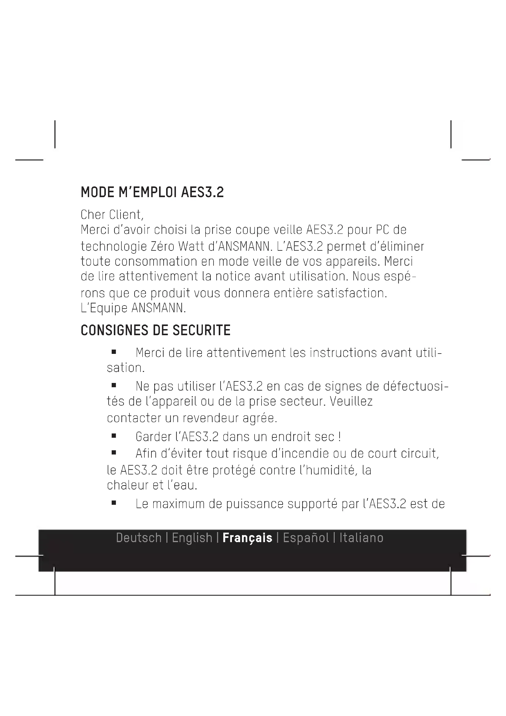 Merci de lire attentivement les instructions avant utili- sation. Ne pas utiliser l’AES3.2 en cas de signes de défectuosi- tés de l’appareil ou de la prise secteur. Veuillez contacter un revendeur agrée. Garder l’AES3.2 dans un endroit sec ! Afin d’éviter tout risque d’incendie ou de court circuit, le AES3.2 doit être protégé contre l’humidité, la chaleur et l’eau. Le maximum de puissance supporté par l’AES3.2 est de Deutsch | English | Français | Español | Italiano2500 Watt ou 10A. Bien s’assurer que cette valeur n’est pas dépassée. Avant de nettoyer l’AES3.2, vérifier à bien le débrancher de la prise secteur. Utiliser un chiffon propre et sec ! Ne jamais essayer d’ouvrir l’appareil et ne pas le laisser à la portée des enfants Le AES3.2 ne doit pas être utilisé par des enfants ou des personnes présentant des déficiences mentales ou physiques, ou par des personnes n’ayant aucune connaissance à moins d’être supervisé par quelqu’un de qualifié Si les consignes de sécurité ne sont pas respectées cela peut entrainer des dommages sur l’appareil et expose l’utilisateur à des accidents. Ne pas essayer de brancher l’AES3.2 sur une prise non adaptée! FONCTIONNEMENT Prise coupe veille intelligente – Utilise la technologie Zéro Watt Deutsch | English | Français | Español | Italiano Flexible : permet de stopper la consommation en mode veille de la plupart des applications Coupe les appareils automatiquement du secteur quand ils ne sont pas utilisés Economie d’énergie – économie d’argent et protection de l’environnement Elimination de la consommation en mode veille ! Convient pour les appareils jusqu’à 2500Watts (10A) de capacité