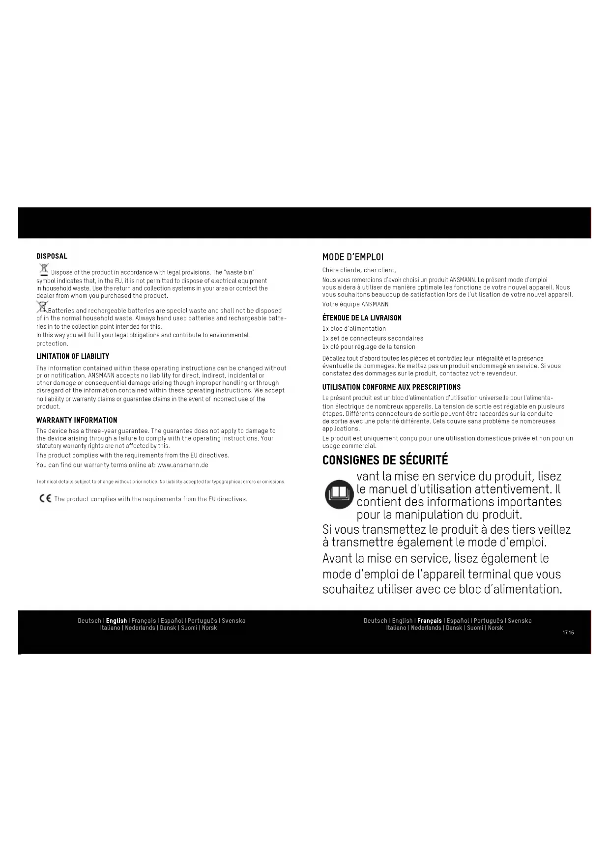 Les informations fournies dans ce mode d'emploi peuvent être modifiées sans notification préalable. ANSMANN n'endosse aucune responsabilité pour les dommages ou dommages conséquents directs, indirects, accidentels ou autre causés par la ma- nipulation inappropriée ou par le non-respect des informations fournies dans ce mode d'emploi. En cas d'usage incorrect du produit, nous n'endossons aucune responsabilité et n'accordons aucun droit de garantie. GARANTIE Nous offrons une garantie de trois ans sur l'appareil. Aucune garantie n'est accordée en cas de dommages sur l'appareil causés par le non-respect du mode d'emploi. Cela n’affecte pas votre droit légal à la garantie. Le produit est conforme aux exigences des directives européennes. Vous trouverez nos conditions de garantie en ligne à l’adresse : www.ansmann.de Informations technique sujettes à changement sans préavis. Aucune responsabilité ne sera acceptée en cas de fautes de frappe, erreurs ou omissions. Le produit est conforme aux exigences des directives européennes.23 22 Deutsch | English | Français | Español | Português | Svenska Italiano | Nederlands | Dansk | Suomi | Norsk