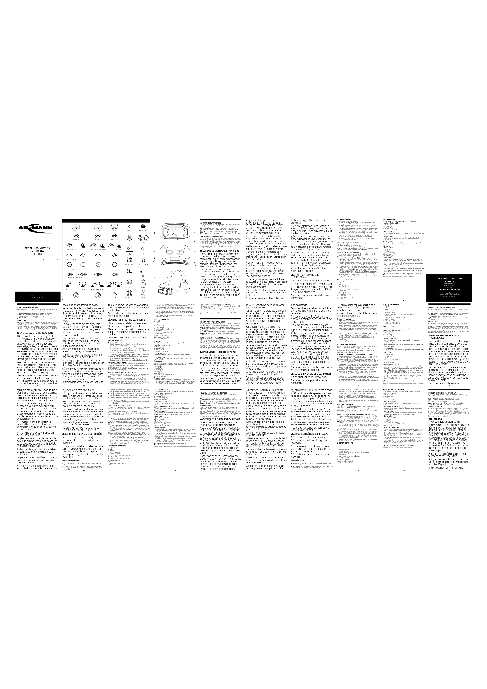 Dispose of packaging after sorting by material type. Cardboard and cardboard to the waste paper, film to the recycling collection. Dispose of the unusable product in accordance with legal provi-sions. The „waste bin“ symbol indicates that, in the EU, it is not permitted to dispose of electrical equipment in household waste. For disposal, pass the product on to a specialist disposal point for old equipment, use the return and collection systems in your area or contact the dealer from whom you purchased the product. Batteries and rechargeable batteries contained in electrical applian- ces must be disposed of separately whenever possible. Always dispose of used batteries & rechargeable batteries (only when discharged) in accordance with the local regulations and requirements. Improper disposal may result in toxic ingredients being released into the environment, which may have adverse health effects on humans, animals and plants. In this way you will fulfil your legal obligations and contribute to en- vironmental protection. PRODUCT DESCRIPTION1. COB LED 2. LED3. Sensor4. Functions button 5. Sensor button 6. Charge socket with rubber cover7. LED display8. Battery compartment closure9. Swivel base10. Mounting magnets11. Removable band holder12. Adjustable head band FIRST USECharge the rechargeable battery pack fully before first use.Press the function button:1x LED high (Spot)2x LED low (Spot)3x COB LED (Wide)4x LED (Spot) + COB LED Dimming function:Possible in all modes by pressing and holding the on/off buttonHand gesture sensor:Pressing the button in the respective mode activates the automatic gesture sensor.Memory function:If a mode is active for more than 4 seconds, the same mode will be activated again the next time the device is switched on.LED display:Battery capacity≥ 30% LED green< 30% LED red< 5%: LED flashes red During the charge process: LED redBattery full: LED greenCharging process: Likewise, when storing over an extended period of time, charge be- forehand (and at least 3x per year during storage) in order to prevent the rechargeable battery pack deep-discharging. To do so, pull the sealing cap out of the charge socket and plug in the charge plug. Then connect the charging cable to the USB charging port. Charge only when switched off. Do not charge and use the light at the same time! Head band holder can be removed by sliding (to the left) and lamp can then be fixed to metallic surfaces by the integrated magnets.Subject to technical changes. We assume no liability for printing errors. SÉCURITÉ - EXPLICATION DES SYMBOLESVeuillez respecter les symboles et mots de signalisation suivants qui sont utilisés dans le mode d’emploi, sur le produit et sur l’emballage : = Information | Informations supplémentaires utiles sur le produit = Remarque | Cette remarque avertit contre des dommages possibles de tout type = Prudence | Attention - le risque peut entraîner des blessures = Avertissement | Attention – danger ! Peut entraîner des blessures graves, voire la mortUTILISATION CONFORME AUX PRESCRIPTIONSLe produit sert de source lumineuse mobile et n’est pas conçu pour d’autres applications. Le produit est uniquement conçu pour une utili-sation privée et ni pour une utilisation commerciale, ni pour l’éclairage ambiant à la maison et uniquement pour l’utilisation telle que décrite dans le mode d’emploi. L’utilisation en dehors de ces informations est considérée comme non conforme, cela peut entraîner des dommages matériels ou des blessures sur les personnes. Nous n’endossons au-cune responsabilité pour les dommages qui résultent d’une utilisation incorrecte ou d‘une utilisation non conforme aux prescriptions. CONSIGNES DE SÉCURITÉ GÉNÉRALES Ce produit peut être utilisé par des enfants à partir de 8 ans et par des personnes avec des capacités physiques, sensorielles ou intellec- tuelles limitées ou avec un manque d’expérience et de connaissances si elles sont surveillées ou si elles ont été instruites concernant l’utilisation de sécurité du produit et si elles con- naissent les dangers. Les enfants ne doivent pas jouer avec le produit. Le nettoyage et l’entretien ne doivent The product complies with the requirements from the EU directives. pas être effectués par des enfants sans surveillance. Tenez les enfants éloignés du produit et de l‘emballage. Le produit n‘est pas un jouet. Les enfants devraient être surveillés afin de s‘assurer qu‘ils ne jouent pas avec le produit ou l’emballage. Éviter les lésions oculaires – Ne jamais regarder directement dans le faisceau lumineux ou ne jamais éc- lairer des personnes dans le visage. Si cela se produit de manière prolon- gée, la part de lumière bleue peut causer un risque pour la rétine. Ne jamais toucher un appareil raccordé au réseau électrique avec les mains mouillées ou si l’appareil est tombé dans l’eau. Dans ce cas, couper tout d’abord le disjoncteur de la maison, puis débrancher la fiche secteur. Ne jamais utiliser dans un environne- ment explosible où se trouvent des liquides inflammables, de la poussiè- re ou des gaz. Ne jamais plonger le produit dans l’eau ou dans un autre liquide. Toujours utiliser une prise bien ac- cessible afin de pouvoir débrancher le produit du réseau électrique en cas de défaut. Tous les objets éclairés doivent être à une distance d‘au moins 10 cm de la lampe. N’utiliser le produit qu’avec les ac- cessoires compris dans l’étendue de la livraison. Ne jamais tenter d’ouvrir, d’écraser, de chauffer ou de mettre en feu une pile / un accu. Ne pas jeter au feu. Ne charger le produit que dans des pièces fermées, au sec et vastes, à l’abri de matériaux et de liquides in- flammables. Le non-respect peut ent- raîner des brûlures et des incendies. Les fuites de piles / les liquides dans les accus peuvent entraîner des brû- lures chimiques en cas de contact avec des parties du corps. En cas