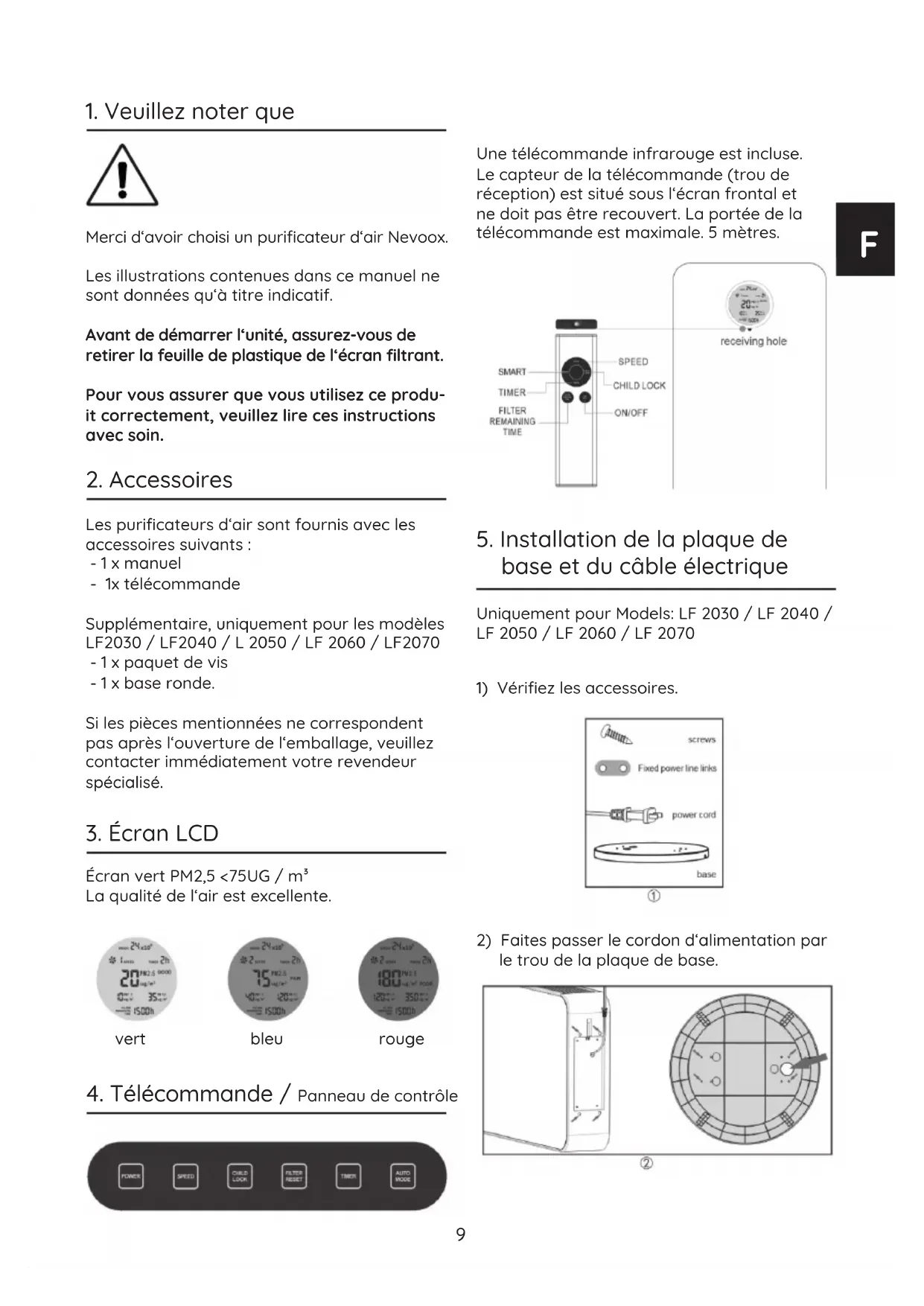 Les puricateurs d‘air sont fournis avec les accessoires suivants : - 1 x manuel - 1x télécommande Supplémentaire, uniquement pour les modèles LF2030 / LF2040 / L 2050 / LF 2060 / LF2070 - 1 x paquet de vis - 1 x base ronde. Si les pièces mentionnées ne correspondent pas après l‘ouverture de l‘emballage, veuillez contacter immédiatement votre revendeur spécialisé.