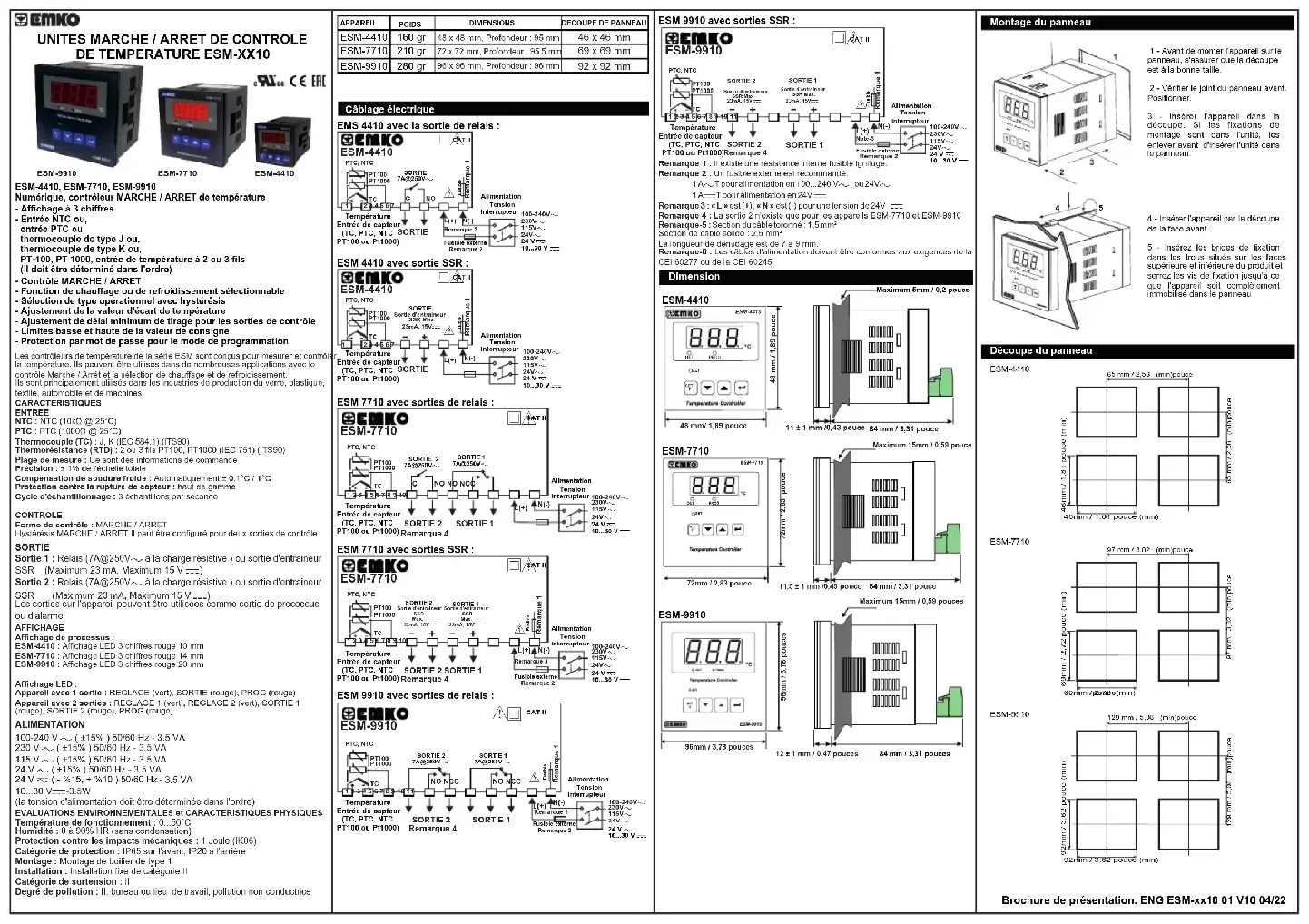 CAT IIYcESM-4410SORTIE7A@250VVPTC, NTCSORTIEAlimentation Tension InterrupteurALIMENTATION (la tension d'alimentation doit être déterminée dans l'ordre)100-240 V V ( ±15% ) 50/60 Hz - 3.5 VA 230 V V ( ±15% ) 50/60 Hz - 3.5 VA 115 V V ( ±15% ) 50/60 Hz - 3.5 VA 24 V V ( ±15% ) 50/60 Hz - 3.5 VA - 3.5 VA10...30 VZ -3.5W 24 V W ( - %15, + %10 ) 50/60 Hz EVALUATIONS ENVIRONNEMENTALES et CARACTERISTIQUES PHYSIQUESTempérature de fonctionnement : 0...50°CHumidité : 0 à 90% HR (sans condensation)Protection contre les impacts mécaniques : 1 Joule (IK06)Catégorie de protection : IP65 sur l'avant, IP20 à l'arrièreMontage : Montage de boitier de type 1Installation : Installation fixe de catégorie IICatégorie de surtension : IIDegré de pollution : II, bureau ou lieu de travail, pollution non conductrice ESM-4410 160 gr 48 x 48 mm, Profondeur : 95 mm 46 x 46 mm