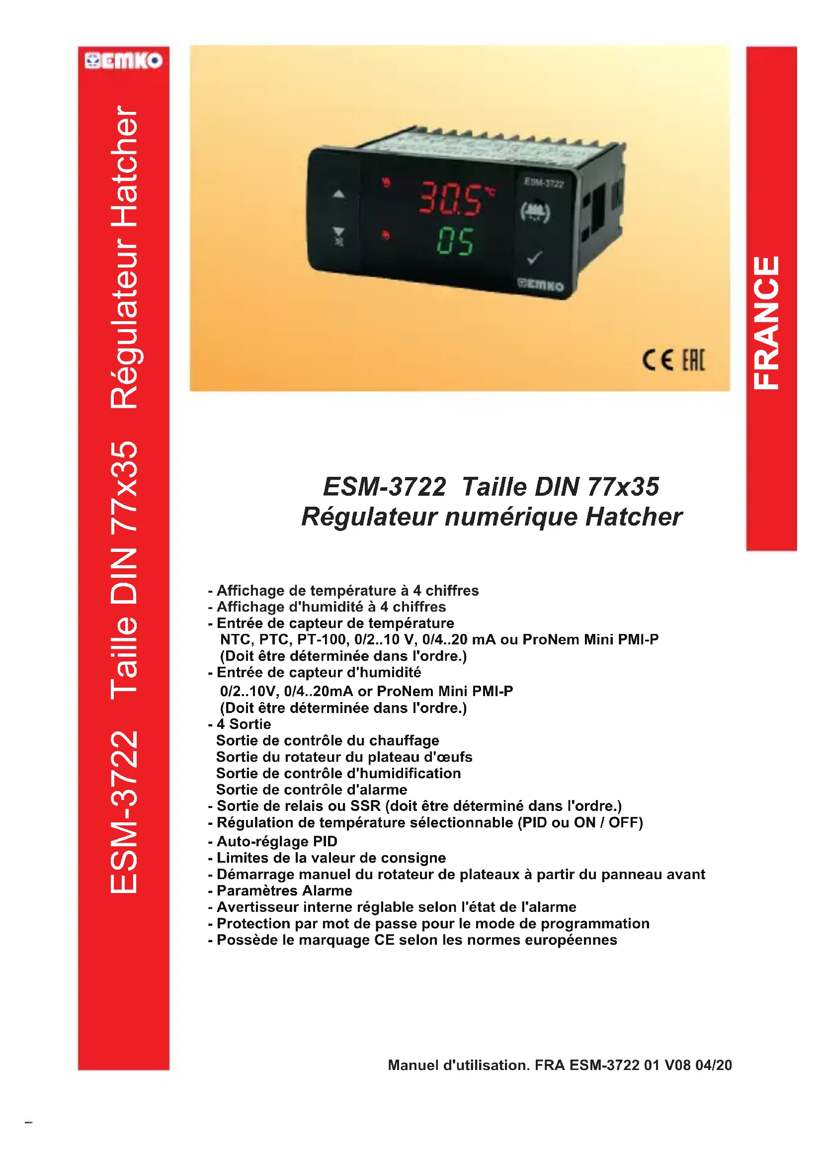 - Ihr Technologiepartner www.emkoelektronik.com.tr Vielen Dank, dass Sie sich für Emko Elektronik Produkte entschieden haben. Bitte besuchen Sie unsere Webseite, um die detaillierte Bedienungsanleitung herunterzuladen.ESM-3722 Taille DIN 77x35 Régulateur Hatcher Manuel d'utilisation. FRA ESM-3722 01 V08 04/20 - Affichage de température à 4 chiffres - Affichage d'humidité à 4 chiffres - Entrée de capteur de température NTC, PTC, PT-100, 0/2 p. 10