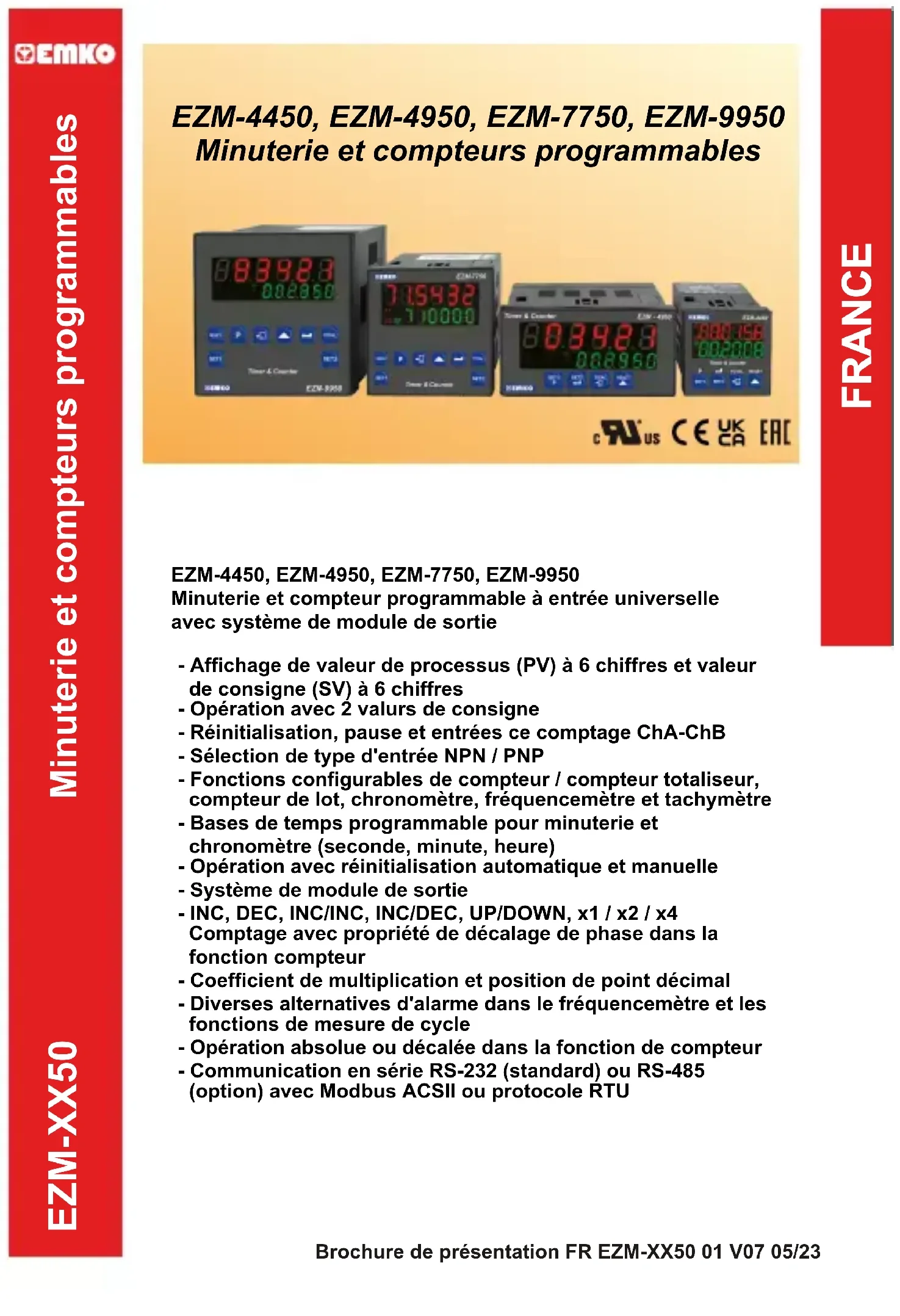 Minuterie et compteur programmable à entrée universelle avec système de module de sortie Brochure de présentation FR EZM-XX50 01 V07 05/23CARACTERISTIQUES : ENTREE : Entrée de comptage (Ch-A, Ch-B) : Un interrupteur, un capteur de proximité, de capacité ou un codeur peuvent être connectés. Entrée de réinitialisation : Un interrupteur, un capteur de proximité, de capacité peuvent être connectés. Entrée de pause : Un interrupteur, un capteur de proximité, de capacité peuvent être connectés. Sélection de type d'entrée : NPN / PNP avec un interrupteur DIP situés sur l'appareil peuvent être sélectionnés. Fonction de réinitialisation : Automatique ou manuelle. Type d'entrée de comptage : INC,DEC,INC/INC,INC/DEC,UP/DOWN ,x1 / x2 / x4 : Comptage de décalage de phase (pour codeur) SORTIE Modules de sortie : Il existe deux prises de module pour brancher les modules de sortie. - Module de sortie de relais - Module de sortie SSR (Max. 26mA, 22V Z ) - Module de sortie numérique (Transistor) (Max.40mA@18VZ) AFFICHAGE Affichage de la valeur actuelle de comptage : EZM-4450 : Affichage LED 6 chiffres rouge 8 mm EZM-4950 : Affichage LED 6 chiffres rouge 13,2 mm EZM-7750 : Affichage LED 6 chiffres rouge 10,8 mm EZM-9950 : Affichage LED 6 chiffres rouge 13,2 mm Affichage de valeur de consigne : EZM-4450 : Affichage LED 6 chiffres vert 8 mm EZM-4950 : Affichage LED 6 chiffres vert 8 mm EZM-7750 : Affichage LED 6 chiffres vert 8 mm EZM-9950 : Affichage LED 6 chiffres vert 8 mm LED : S1 (valeur de Set1), S2 (Valeur de Set2), O1/2 (statut de sortie) LED. TENSION D'ALIMENTATION Tension d'alimentation