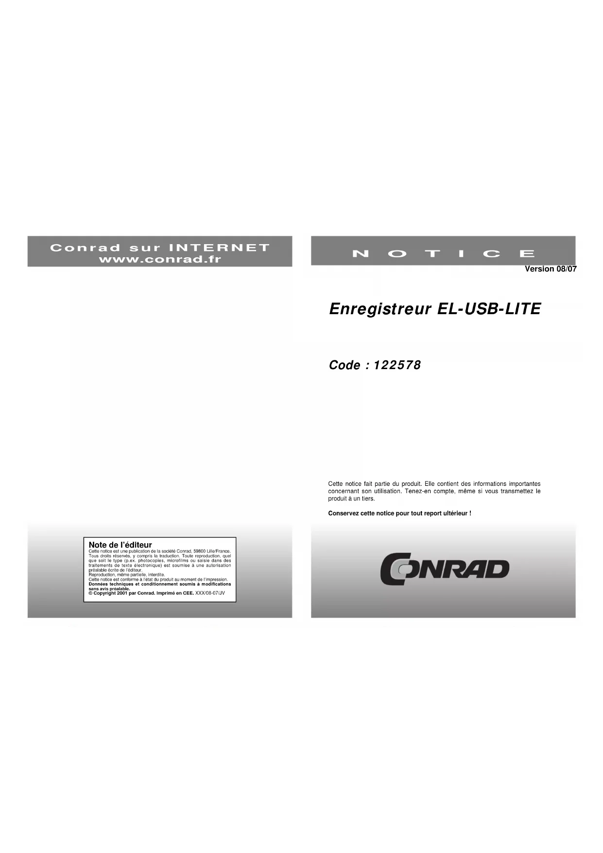 Note de l’éditeur Cette notice est une publication de la société Conrad, 59800 Lille/France.Tous droits réservés, y compris la traduction. Toute reproduction, quelque soit le type (p.ex. photocopies, microfilms ou saisie dans destraitements de texte électronique) est soumise à une autorisationpréalable écrite de l’éditeur.Reproduction, même partielle, interdite.Cette notice est conforme à l’état du produit au moment de l’impression.Données techniques et conditionnement soumis à modificationssans avis préalable.© Copyright 2001 par Conrad. Imprimé en CEE. XXX/08-07/JV Enregistreur EL-USB-LITE Code : 122578 Cette notice fait partie du produit. Elle contient des informations importantes concernant son utilisation. Tenez-en compte, même si vous transmettez le produit à un tiers. Conservez cette notice pour tout report ultérieur ! NOTICE Conrad sur INTERNET www.conrad.fr Version 08/072 7Windows