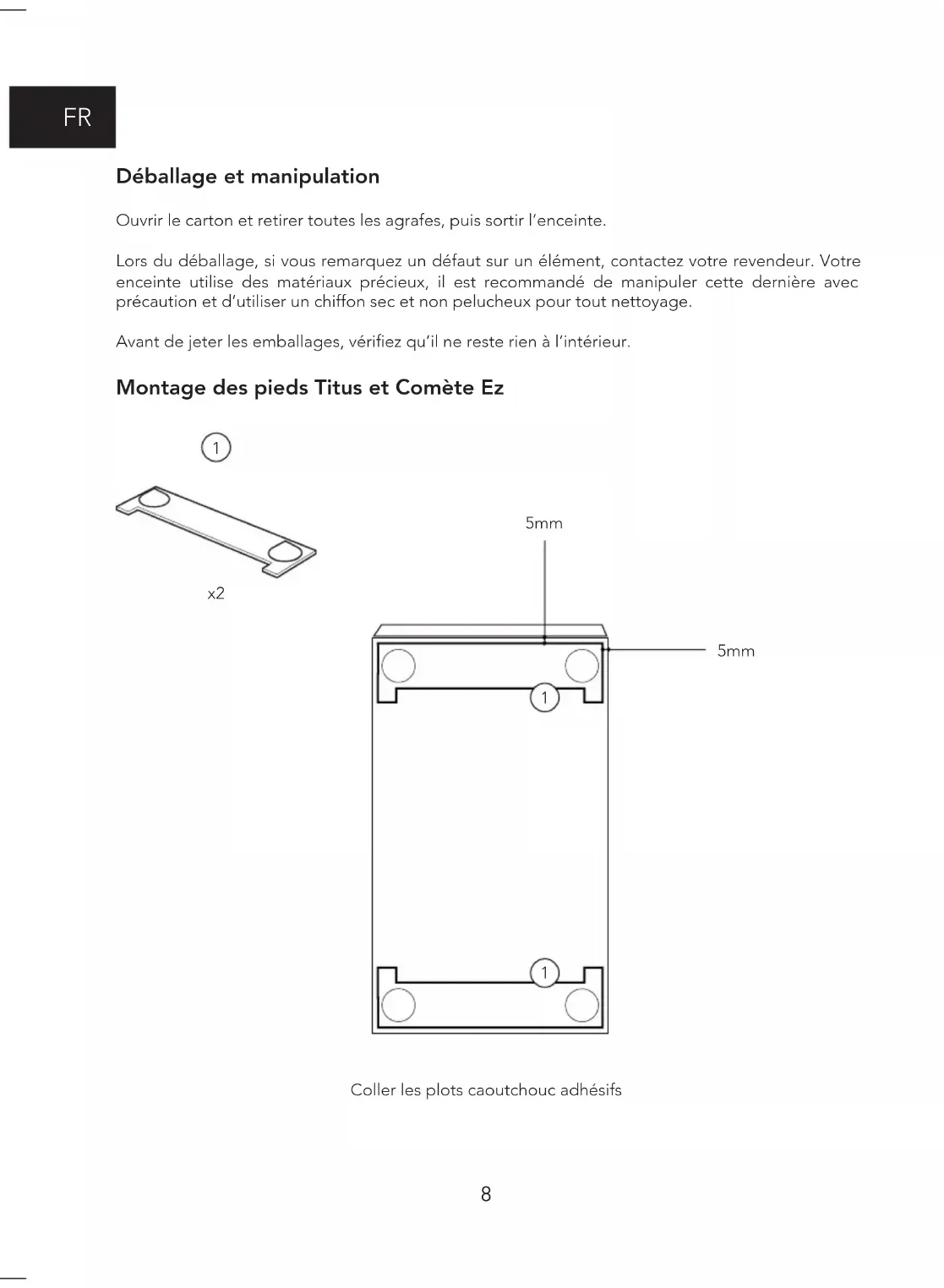 Déballage et manipulation Ouvrir le carton et retirer toutes les agrafes, puis sortir l’enceinte. Lors du déballage, si vous remarquez un défaut sur un élément, contactez votre revendeur. Votre enceinte utilise des matériaux précieux, il est recommandé de manipuler cette dernière avec précaution et d’utiliser un chiffon sec et non pelucheux pour tout nettoyage. Avant de jeter les emballages, vériez qu’il ne reste rien à l’intérieur. Montage des pieds Titus et Comète Ez Coller les plots caoutchouc adhésifs