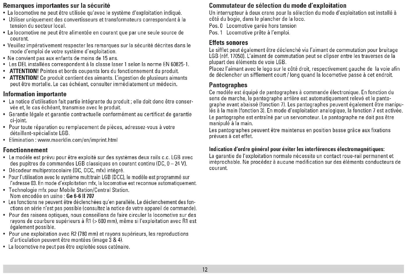- La locomotive ne peut pas être exploitée sous caténaire. Commutateur de sélection du mode d’exploitation Un interrupteur à deux crans pour la sélection du mode d’exploitation est installé à côté du bogie, dans le plancher de la loco. Pos. 0 Locomotive garée hors tension Pos. 1 Locomotive prête à l’emploi. Effets sonores Le sifflet peut également être déclenché via l’aimant de commutation pour bruitage LGB (réf. 17050). L’aimant de commutation peut se clipser entre les traverses de la plupart des éléments de voie LGB. Placez l’aimant avec le logo sur le côté droit, respectivement gauche de la voie afin de déclencher un sifflement court / long quand la locomotive passe à cet endroit. Pantographes Ce modèle est équipé de pantographes à commande électronique. En fonction du sens de marche, le pantographe arrière est automatiquement relevé et le panto- graphe avant abaissé (fonction 7). Les pantographes peuvent également être manipu- lés à la main (fonction 3). En mode d‘exploitation analogique, la fonction 7 est activée. Le pantographe est entraîné par un servomoteur. Le pantographe ne doit pas être manipulé à la main. Les pantographes peuvent être maintenus en position basse grâce aux fixations prévues à cet effet. Indication d‘ordre général pour éviter les interférences électromagnétiques: La garantie de l‘exploitation normale nécessite un contact roue-rail permanent et irréprochable. Ne procédez à aucune modification sur des éléments conducteurs de courant.13 Mode multiprotocole Mode analogique On peut aussi faire fonctionner le décodeur sur des installations ou des sections de voie analogiques. Le décodeur identifie automatiquement la tension de voie analo- gique (CC). Toutes les fonctions qui ont été paramétrée pour le mode analogique sous mfx ou sous DCC sont actives (voir mode numérique). Les fonctions sonores intégrées ne sont pas activées au départ d’usine pour l’exploi- tation analogique. Mode numérique Les décodeur sont des décodeur multiprotocole. Le décodeur peut être utilisé avec les protocoles numériques suivants : mfx, DCC Le protocole numérique offrant les possibilités les plus nombreuses est le protocole numérique à bit de poids fort. La hiérarchisation des protocoles numériques est descendante : Priorité 1 : mfx; Priorité 2 : DCC; Priorité 3 :