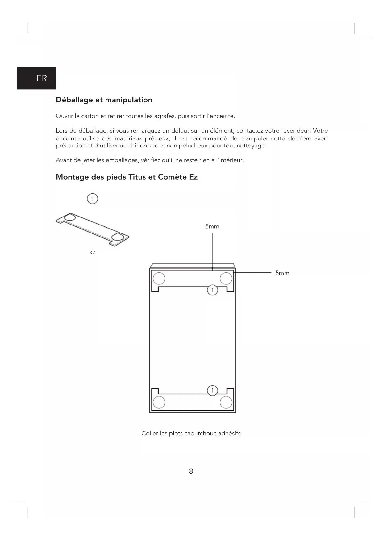 Déballage et manipulation Ouvrir le carton et retirer toutes les agrafes, puis sortir l’enceinte. Lors du déballage, si vous remarquez un défaut sur un élément, contactez votre revendeur. Votre enceinte utilise des matériaux précieux, il est recommandé de manipuler cette dernière avec précaution et d’utiliser un chiffon sec et non pelucheux pour tout nettoyage. Avant de jeter les emballages, vériez qu’il ne reste rien à l’intérieur. Montage des pieds Titus et Comète Ez Coller les plots caoutchouc adhésifs