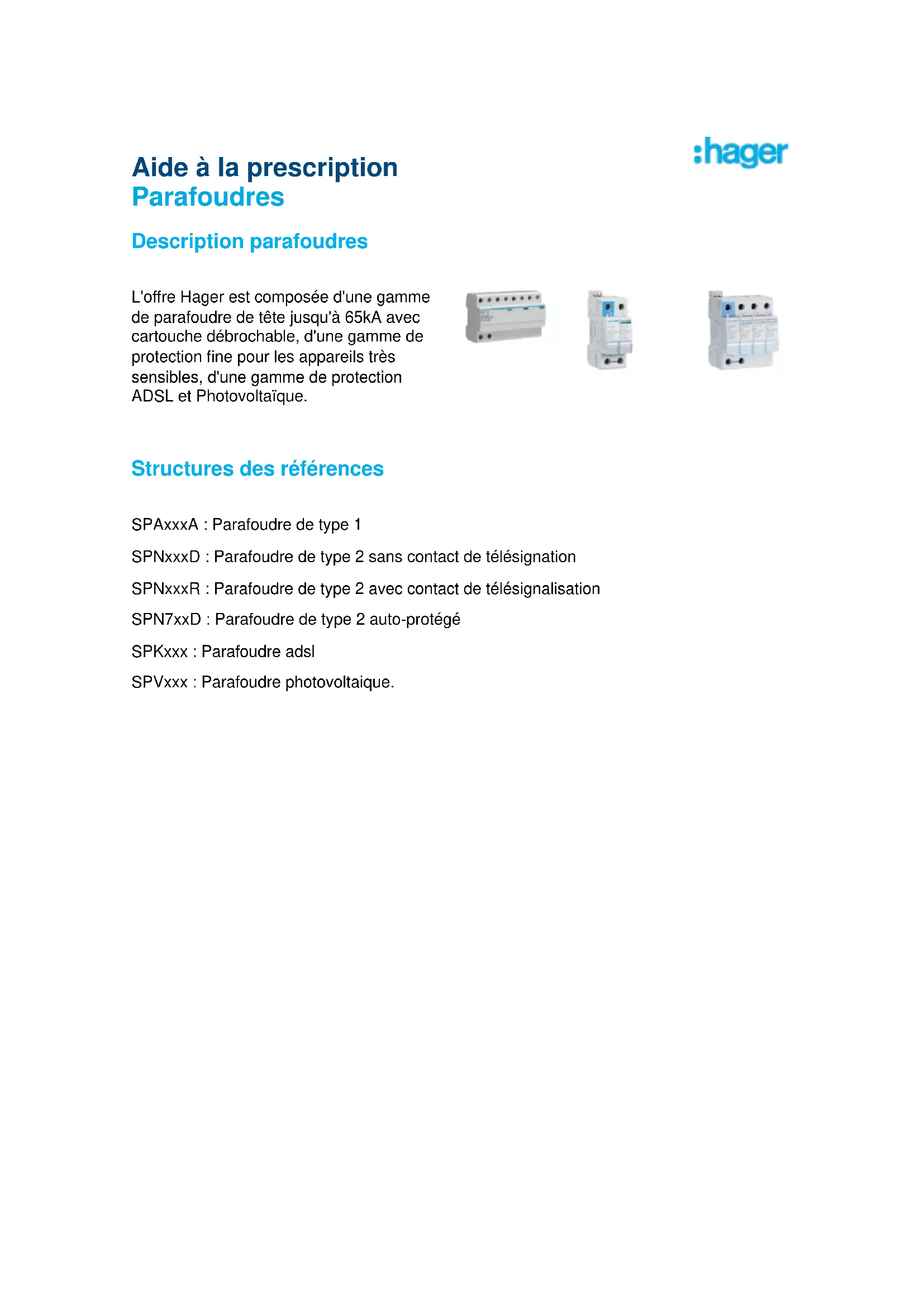 Aide à la prescription Parafoudres Description parafoudres L'offre Hager est composée d'une gamme de parafoudre de tête jusqu'à 65kA avec cartouche débrochable, d'une gamme de protection fine pour les appareils très sensibles, d'une gamme de protection ADSL et Photovoltaïque. Structures des références SPAxxxA : Parafoudre de type 1 SPNxxxD : Parafoudre de type 2 sans contact de télésignation SPNxxxR : Parafoudre de type 2 avec contact de télésignalisation SPN7xxD : Parafoudre de type 2 auto-protégé SPKxxx : Parafoudre adsl SPVxxx : Parafoudre photovoltaique.Aide à la prescription Parafoudres Caractéristiques détaillées des parafoudres type 1 : SPAxxx Couple de serrage 3,6Nm Fréquence assignée 50/60 Hz Courant nominal de décharge (In) 8/20µs, IEC 61643)L-N(PEN)/ N-PE