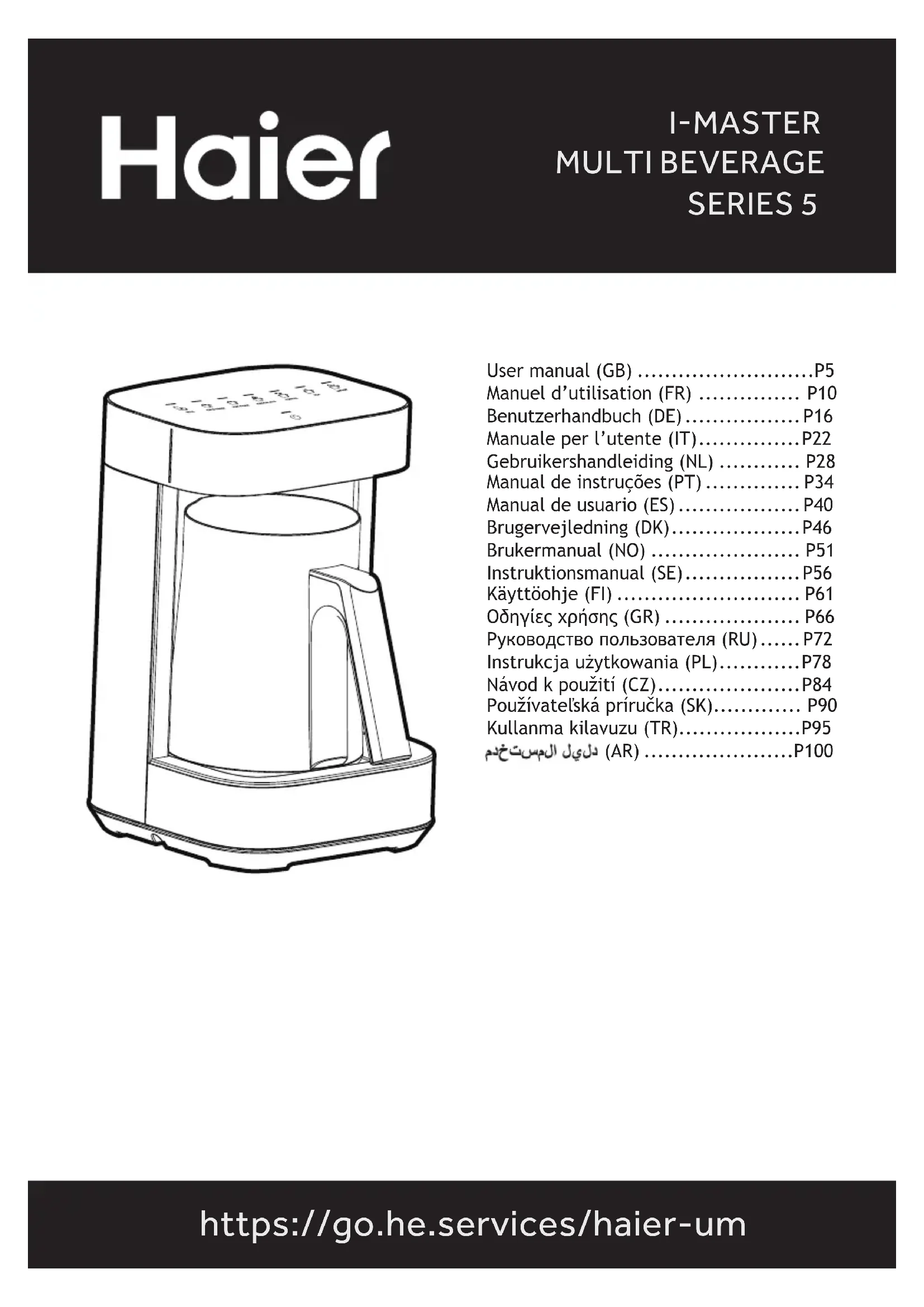 MAX WATER MAX MILK MIN EU 2023/826 Power Consumption Off Mode N.A. Power Consumption StandBy Mode 0.5W Power Consumption StandBy Mode with info display N.A. Power Consumption Networked StandBy N.A. Time to reach Off Mode/ StandBy/StandBy with display/ Networked StandBy 10min10 Cet appareil est destiné à un usage domestique uniquement, tel que décrit dans ce guide d’utilisation. Veuillez vous assurer que ces instructions sont bien comprises avant d’utiliser l’appareil. Cet appareil peut être utilisé par des enfants âgés d’au moins 8 ans et par des personnes ayant des capacités physiques, sensorielles ou mentales réduites, ou n’ayant pas d’expérience ou de connaissances en la matière. Ces dernières doivent recevoir des instructions sur l’utilisation de l’appareil en toute sécurité et comprendre les risques impliqués. Tenez les enfants de moins de 8 ans éloignés de l’appareil et du câble de raccordement et ne les autorisez pas à utiliser l’appareil. Les enfants ne doivent pas jouer avec l’appareil. Le nettoyage et l’entretien ne doivent pas être effectués par des enfants, sauf s’ils ont plus de 8 ans et sont supervisés. Utilisez l’appareil uniquement à l’intérieur et à des altitudes ne dépassant pas 2 000 m au- dessus du niveau de la mer. Si le cordon d’alimentation est endommagé, arrêtez immédiatement d’utiliser l’appareil. Le cordon d’alimentation doit être remplacé par un technicien de service agréé Haier an d’éviter tout danger. N’utilisez que les accessoires, les consommables et les pièces de rechange recommandés ou fournis par Haier. N’utilisez l’appareil qu’en fonction de la puissance indiquée sur la che signalétique. Cet appareil est sensé être utilisé dans un environnement domestique et dans les applications ci-dessous : - Dans les zones cuisine du personnel dans les magasins, les bureaux et les environnements de travail ; - Dans les agritourismes ; - Par les clients dans les hôtels, les motels et autres environnements type ; - Dans les environnements type chambre d’hôtes. L’appareil ne doit être utilisé qu’avec la base fournie. PRÉCAUTIONS : Ne remplissez jamais le récipient au-dessus du niveau maximum car le café qui mousse ou d’autres liquides (par ex. le lait) pourraient déborder pendant le réchauffement. AVERTISSEMENT Évitez tout débordement sur le connecteur. N’immergez jamais l’appareil.