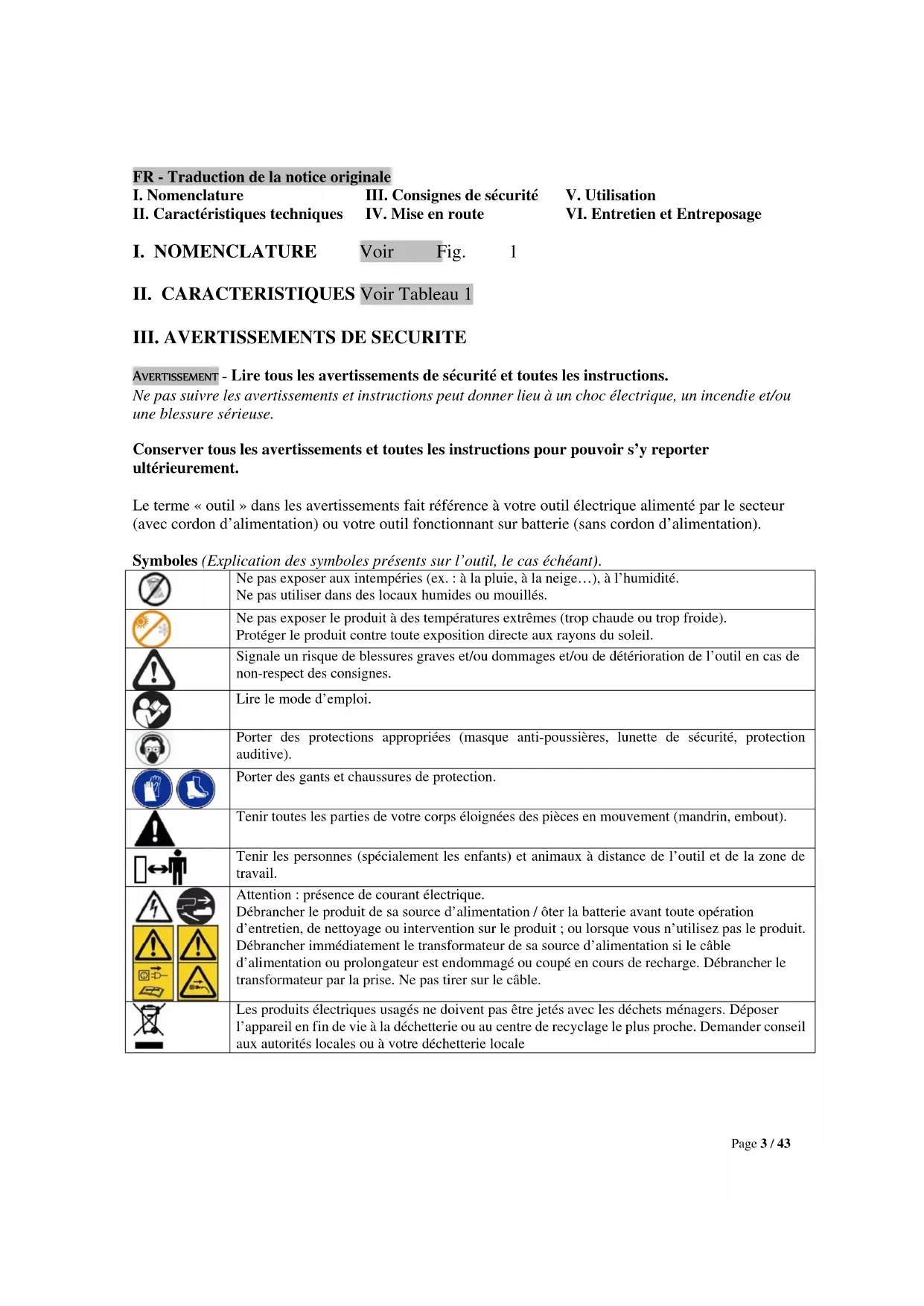 Attention : présence de courant électrique. Débrancher le produit de sa source d’alimentation / ôter la batterie avant toute opération d’entretien, de nettoyage ou intervention sur le produit ; ou lorsque vous n’utilisez pas le produit. Débrancher immédiatement le transformateur de sa source d’alimentation si le câble d’alimentation ou prolongateur est endommagé ou coupé en cours de recharge. Débrancher le transformateur par la prise. Ne pas tirer sur le câble. Les produits électriques usagés ne doivent pas être jetés avec les déchets ménagers. Déposer l’appareil en fin de vie à la déchetterie ou au centre de recyclage le plus proche. Demander conseil aux autorités locales ou à votre déchetterie localePage 4 / 43