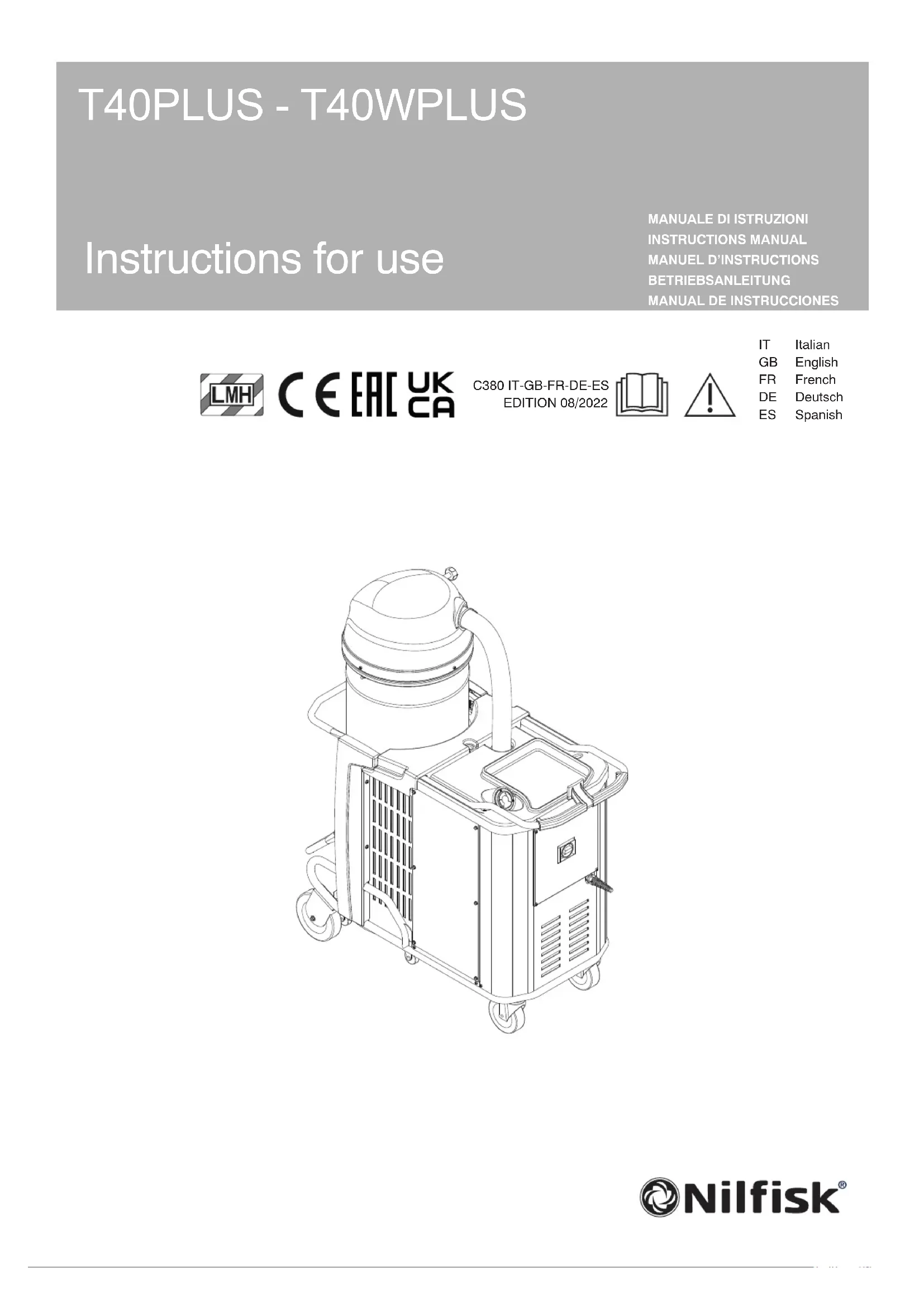 Figure 3 Modèle A (mm) B (mm) C (mm) kg (*) TxxPLUS L L50 700 1350 1500 200 TxxPLUS L L100 700 1350 1850 200 TxxPLUS M/H 700 1350 1850 200 (* ) Poids avec emballage Déballage, manutention, emploi et stockage Pour déballer l’unité d’aspiration, retirer les supports avec un marteau et un tournevis. Retirer également les dispositifs de xation placés par le fabricant lors de l’emballage, à l’aide d’outils appropriés. Débloquer les freins des roues et retirer la machine de la plateforme de support, en utilisant une rampe qui peut fournir une capacité adéquate, et en conduisant l’aspirateur par la poignée. Travailler sur des surfaces plates et horizontales. La portée du plan d’appui sur lequel repose la machine doit être adaptée à son poids. En cas d’utilisation à poste xe, prévoir un grand espace autour de l’appareil de façon à se déplacer librement et à permettre aux opérateurs d’eectuer les opérations d’entretien sans dicultés. ATTENTION ! Le fabricant décline toutes responsabilités en cas de dégâts causés à la machine pendant le levage, si l’on n’utilise pas l’équipement de levage fourni par le fabricant. ATTENTION ! Lorsque plusieurs plateformes de support sont prévues, la plateforme de support sur laquelle la machine est ancrée doit être manipulée à l’aide d’un chariot élévateur qui peut fournir une capacité susante. Déballer ensuite la machine en la déposant sur une surface plane et horizontale qui peut fournir une capacité susante pour le poids de l’aspirateur. Mise en service - raccordement au réseau d’alimentation électrique ATTENTION ! ■ Avant la mise en service, s’assurer qu’il n’y a aucun signe de dommage à la machine. ■ Avant de brancher la machine au réseau, s’assurer que la tension indiquée sur la plaque corresponde à celle du réseau. ■ Brancher la che du câble de connexion dans une prise avec contact / raccordement de mise à la terre installé correctement. S’assurer que la machine est éteinte. ■ Les ches et les connecteurs des câbles de connexion au réseau doivent être protégés contre les éclaboussures d’eau. ■ Contrôler si le branchement au réseau électrique est correct. ■ N’utiliser que des machines dont les câbles de connexion au réseau électrique sont en parfait état (si le câble est endommagé, il y a risque d’électrocution !). ■ Vérier régulièrement l’absence de dommages et de signes d’usure, déchirures ou vieillissement du câble de branchement au réseau. ATTENTION ! ■ Lorsque l'appareil fonctionne, éviter de marcher, écraser, tirer ou endommager le câble qui le raccorde au secteur électrique. ■ Lorsque l'appareil fonctionne, éviter de débrancher le câble du secteur en tirant simplement sur la che (ne pas tirer sur le câble en lui-même). ■ En cas de remplacement du câble d’alimentation électrique, le remplacer par un câble d’origine du même type : H07 RN-F. la même règle est valable si l’on utilise une rallonge. ■ Le câble d’alimentation doit être remplacé par le Service après-vente du constructeur ou par du personnel qualié équivalent. Les responsables de la sécurité des installations doivent s'assurer que : ■ Prévenir toute utilisation ou manœuvre inappropriée. ■ Vérier que les dispositifs de sécurité n’ont pas été retirés ou déjoués. ■ Contrôler que toutes les opérations d’entretien sont régulièrement accomplies ; ■ Vérier qu’aucune pièce de la machine (raccords, orices, etc.) n’a été modiée pour y xer des dispositifs supplémentaires ; ■ Vérier que seuls des pièces détachées d’origine Nilsk sont utilisées. REMARQUE L’utilisateur sera responsable de la conformité de l’installation à toutes les dispositions légales en vigueur au niveau local. La machine doit être installée par un technicien qualié ayant lu et compris les instructions de ce manuel.T40PLUS - T40WPLUS 7 C380