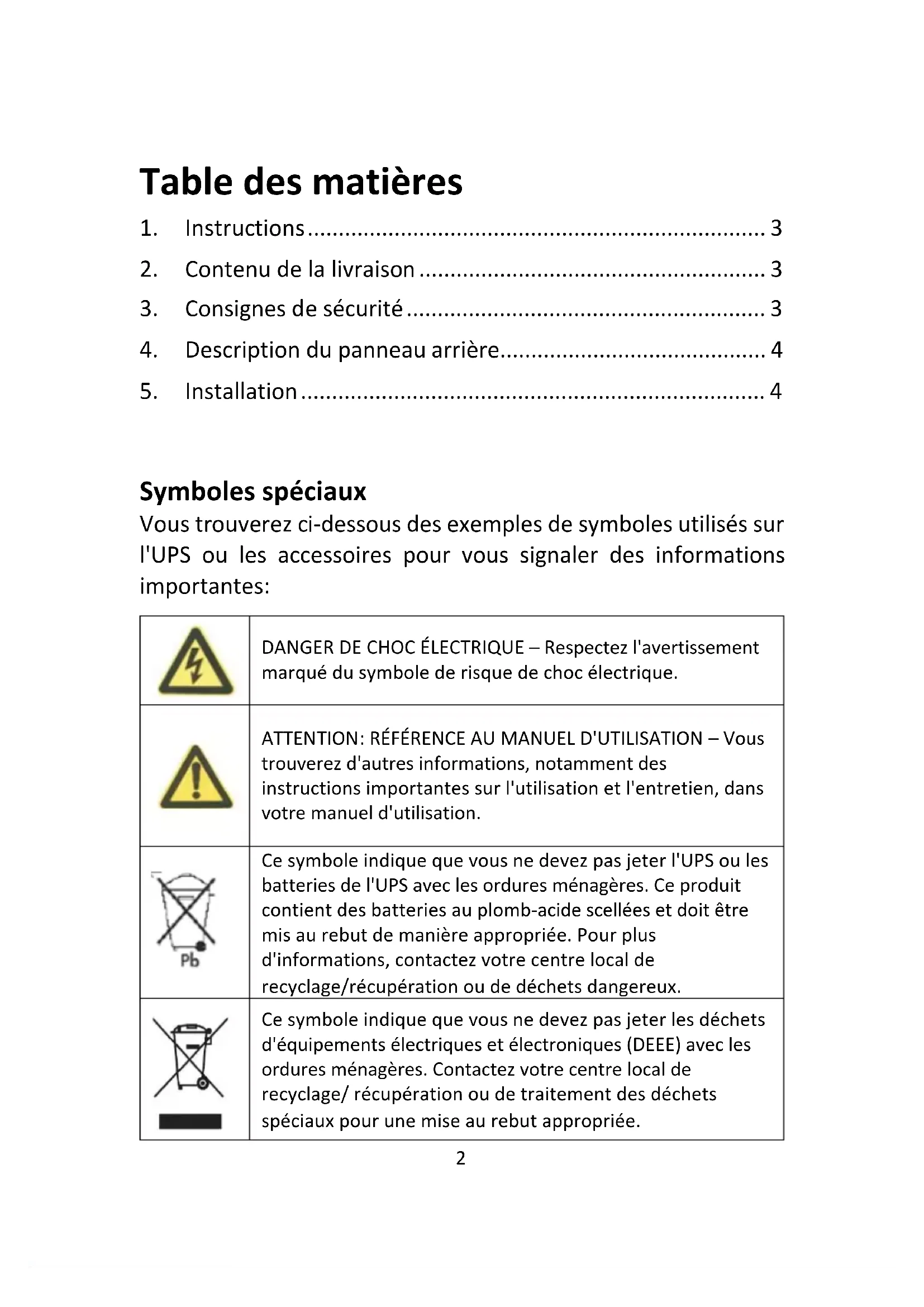 DANGER DE CHOC ÉLECTRIQUE – Respectez l'avertissement marqué du symbole de risque de choc électrique. ATTENTION: RÉFÉRENCE AU MANUEL D'UTILISATION – Vous trouverez d'autres informations, notamment des instructions importantes sur l'utilisation et l'entretien, dans votre manuel d'utilisation. Ce symbole indique que vous ne devez pas jeter l'UPS ou les batteries de l'UPS avec les ordures ménagères. Ce produit contient des batteries au plomb-acide scellées et doit être mis au rebut de manière appropriée. Pour plus d'informations, contactez votre centre local de recyclage/récupération ou de déchets dangereux. Ce symbole indique que vous ne devez pas jeter les déchets d'équipements électriques et électroniques (DEEE) avec les ordures ménagères. Contactez votre centre local de recyclage/ récupération ou de traitement des déchets spéciaux pour une mise au rebut appropriée.3