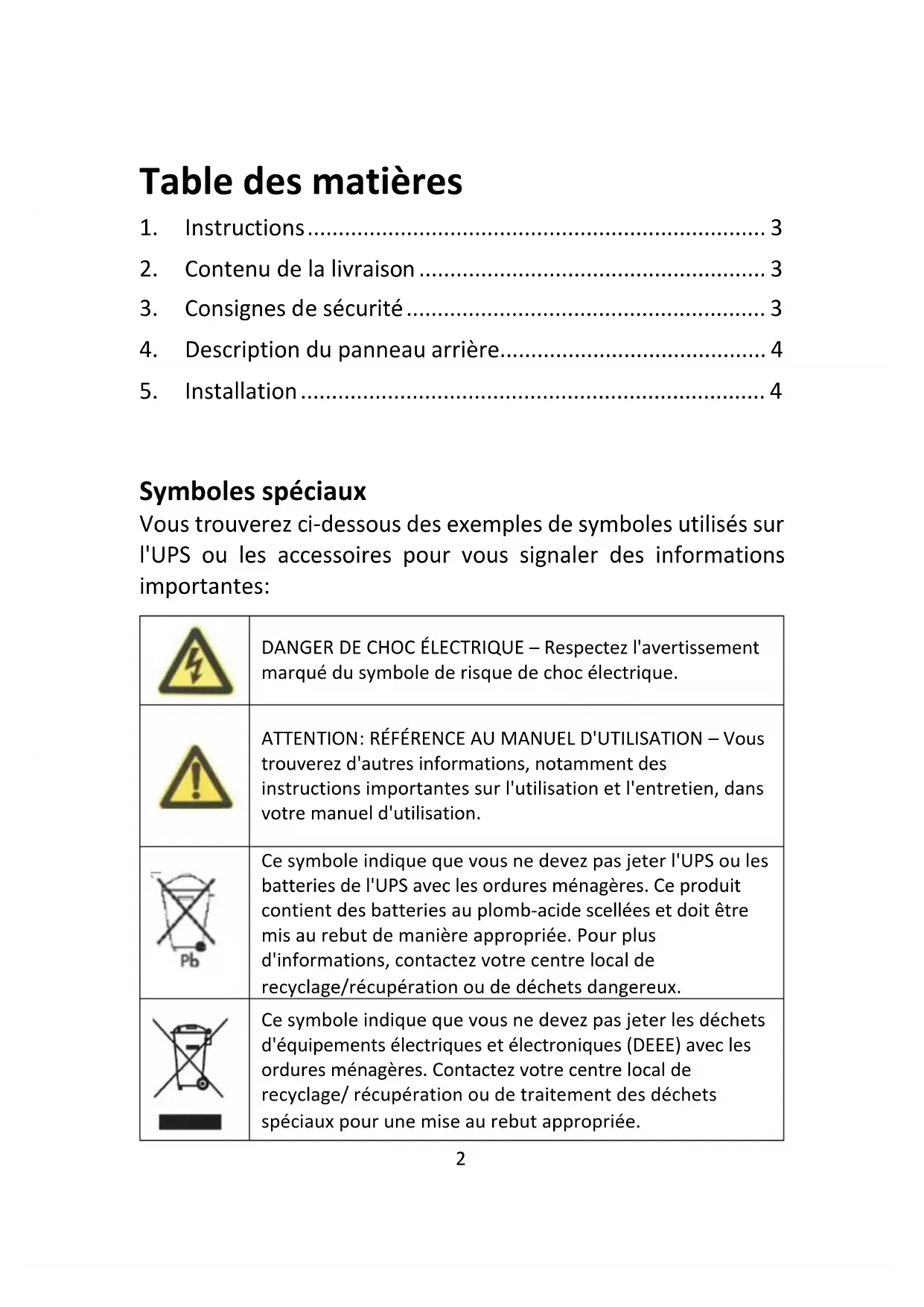 DANGER DE CHOC ÉLECTRIQUE – Respectez l'avertissement marqué du symbole de risque de choc électrique. ATTENTION: RÉFÉRENCE AU MANUEL D'UTILISATION – Vous trouverez d'autres informations, notamment des instructions importantes sur l'utilisation et l'entretien, dans votre manuel d'utilisation. Ce symbole indique que vous ne devez pas jeter l'UPS ou les batteries de l'UPS avec les ordures ménagères. Ce produit contient des batteries au plomb-acide scellées et doit être mis au rebut de manière appropriée. Pour plus d'informations, contactez votre centre local de recyclage/récupération ou de déchets dangereux. Ce symbole indique que vous ne devez pas jeter les déchets d'équipements électriques et électroniques (DEEE) avec les ordures ménagères. Contactez votre centre local de recyclage/ récupération ou de traitement des déchets spéciaux pour une mise au rebut appropriée.3