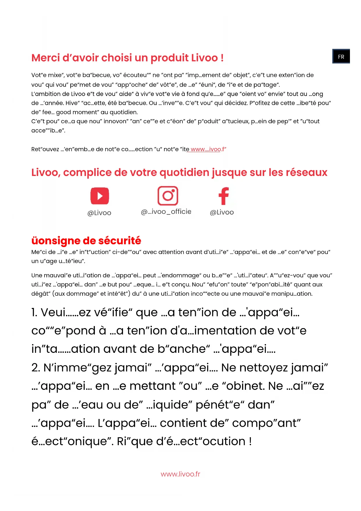 Merci d’avoir choisi un produit Livoo ! Votre mixer, votre barbecue, vos écouteurs ne sont pas simplement des objets, c’est une extension de vous qui vous permet de vous rapprocher des vôtres, de les réunir, de rire et de partager. L’ambition de Livoo est de vous aider à vivre votre vie à fond qu’elles que soient vos envies tout au long de l’année. Hiver raclette, été barbecue. Ou l’inverse. C’est vous qui décidez. Profitez de cette liberté pour des feel good moments au quotidien. C’est pour cela que nous innovons sans cesse et créons des produits astucieux, plein de pep’s et surtout accessibles. Retrouvez l’ensemble de notre collection sur notre site www.livoo.fr Livoo, complice de votre quotidien jusque sur les réseaux