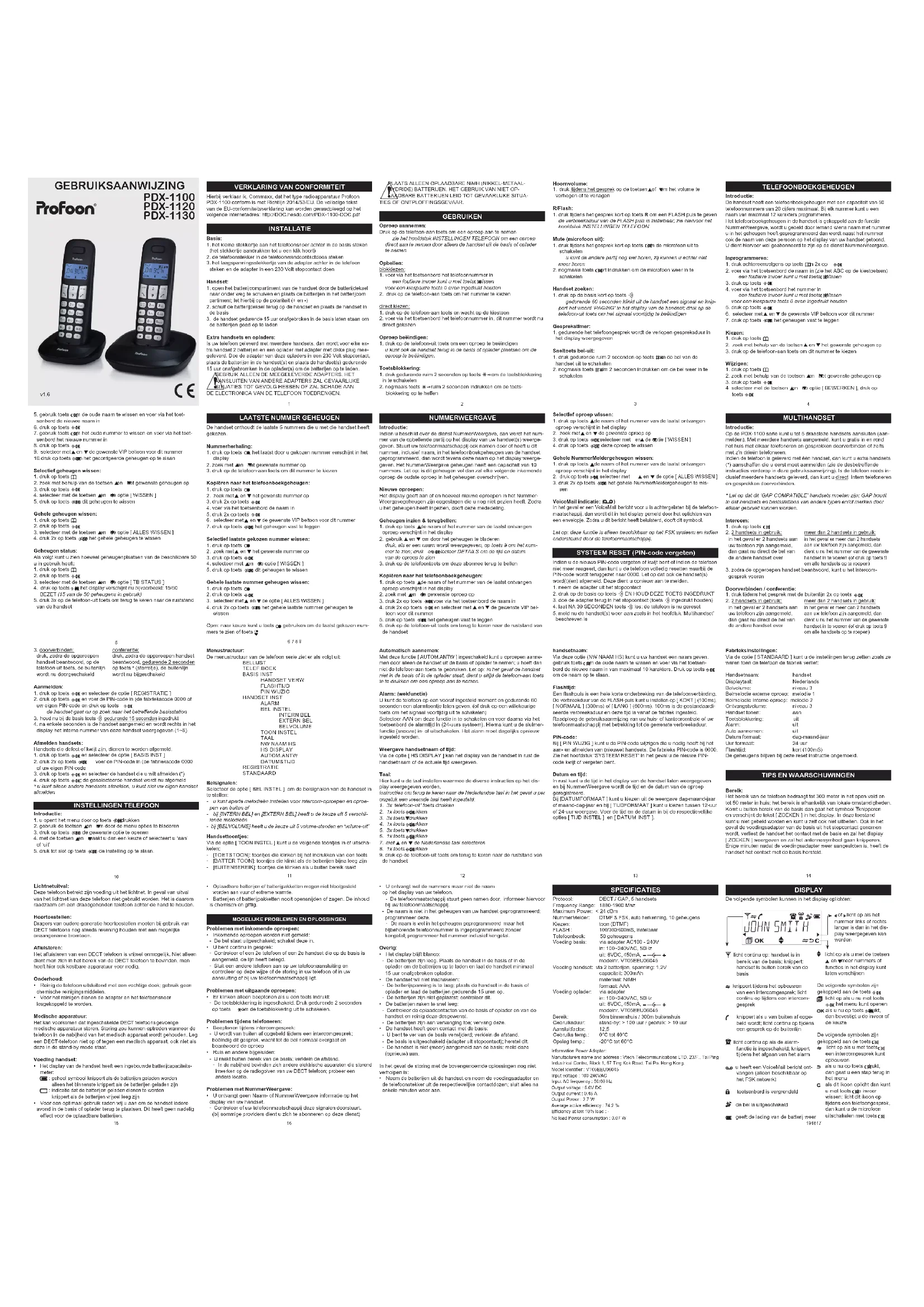 Le soussigné, Commaxx, déclare que l’équipement radioélectrique du type Profoon PDX-1100 est conforme à la directive 2014/53/UE. Le texte complet de la déclaration UE de conformité est disponible à l’adresse internet suivante: http://DOC.hesdo.com/PDX-1100-DOC.pdf INSTALLATION Base : 1.mettezlapetitecheaucordontéléphoniqueàl’arrièredanslabase (poussez jusqu’au clic) 2.mettezlachetéléphoniquedanslaprisedecontacttéléphonique murale 3.mettezlachetensionbassedel’adaptateuràl’arrièredansletélé- phone et mettez l’adaptateur dans une prise de 230 Volt Combiné :