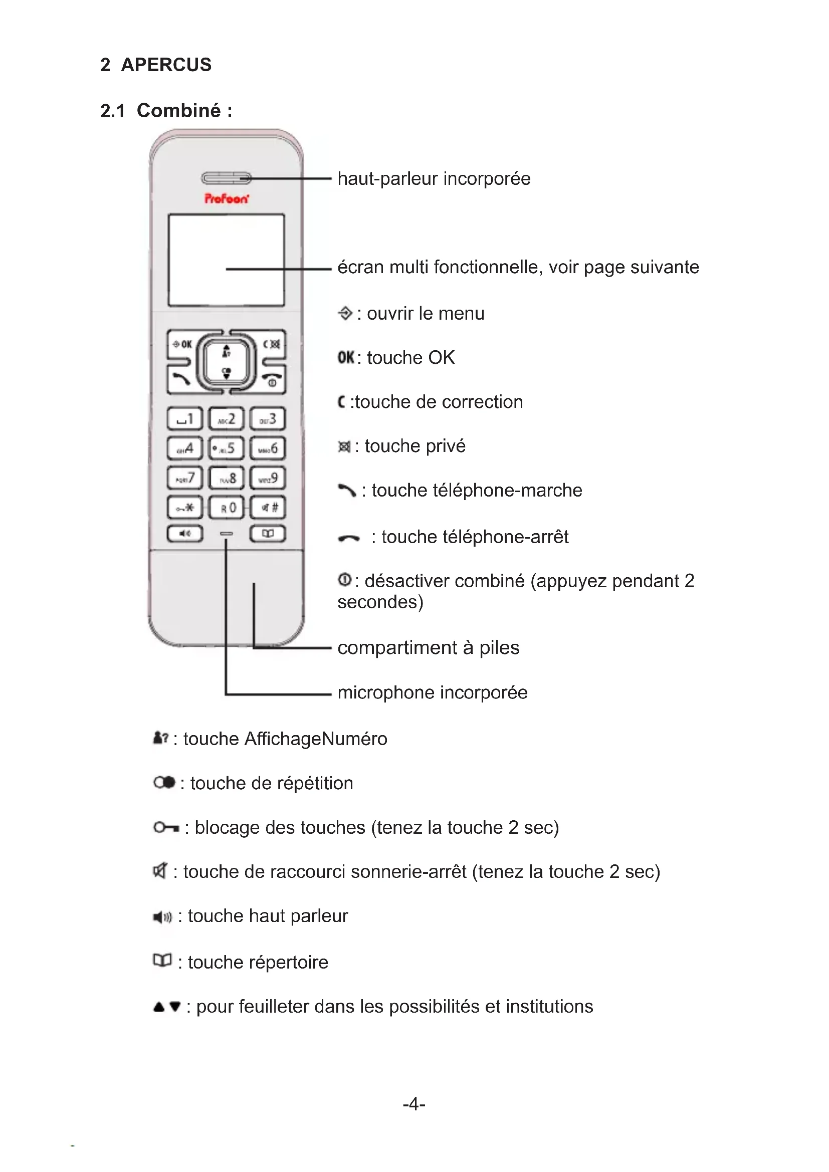 haut-parleur incorporée écran multi fonctionnelle, voir page suivante : ouvrir le menu : touche OK : touche de correction : touche privé : touche téléphone-marche : touche téléphone-arrêt : désactiver combiné (appuyez pendant 2 secondes) compartiment à piles microphone incorporée : touche AchageNuméro : touche de répétition : blocage des touches (tenez la touche 2 sec) : touche de raccourci sonnerie-arrêt (tenez la touche 2 sec) : touche haut parleur : touche répertoire : pour feuilleter dans les possibilités et institutions-5-