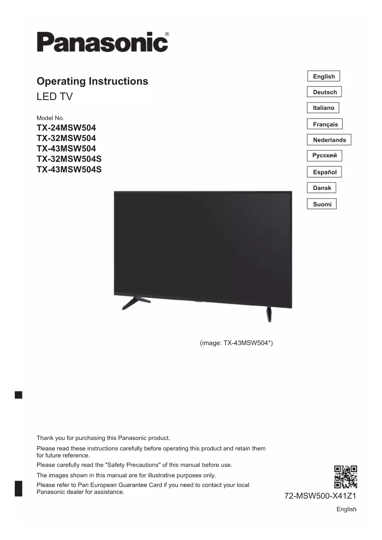 Français Nous vous remercions d’avoir choisi ce produit Panasonic. Veuillez lire attentivement ces instructions avant d’utiliser ce produit et les conserver pour toute consultation future. Veuillez lire également les « Consignes de sécurité » données dans ce manuel avant l’utilisation. Les images de ce manuel sont données uniquement à titre d’illustration. Veuillez vous référer à la Carte de garantie paneuropéenne si vous devez contacter votre revendeur Panasonic local pour obtenir de l’aide. (illuration:TX-43MSW504*) FrançaisFrançais