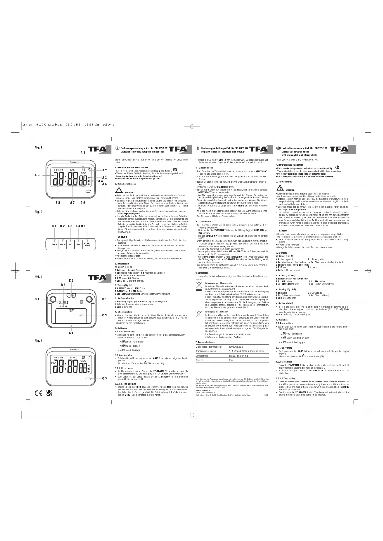 - Chronomètre : Appuyez sur la touche START/STOP (affichage 0:00:00) et le chronomètre commence à compter. Appuyez sur la touche START/STOP pour arrêter et redémarrer le comptage.• Le minuteur/chronomètre continue même si vous changez de mode d'afficha-ge. Le symbole de minuteur clignote.6. Traitement des déchetsÉliminez les emballages de manière respectueuse de l'environnement par le biaisdes systèmes de collecte établis.Mise au rebut de l'appareil électriqueRetirez de l'appareil les piles et les batteries rechargeables qui ne sontpas installées de façon permanente et jetez-les séparément.Cet appareil est conforme aux normes de l'UE relatives au traitementdes déchets électriques et électroniques (WEEE). L'appareil usagé ne doit pas être jeté dans les ordures ménagères.L’utilisateur s’engage, pour le respect de l’environnement, à déposerl’appareil usagé dans un centre de traitement agréé pour les déchetsélectriques et électroniques. La collecte est gratuite. Respectez lesréglementations en vigueur !Élimination des pilesLes piles et les batteries rechargeables ne doivent pas être jetées dansles détritus ménagers. Elles contiennent des polluants qui peuventnuire à l'environnement et à la santé si elles sont éliminées de manièreinappropriée. En tant qu'utilisateur, vous avez l'obligation légale derapporter les piles et batteries rechargeables usagées à votre reven-deur ou de les déposer dans une déchetterie proche de votre domicileconformément à la réglementation nationale et locale. La collecte estgratuite.Les métaux lourds sont désignés comme suit : Cd = cadmium, Hg = mercure, Pb = plomb. 7. Caractéristiques techniquesPlage de mesure minuteur/chronomètre 23h/59min/59 sAlimentation Piles 2 x 1,5 V AAA (non incluses)Dimensions du boîtier 83 x 22 (47) x 64 mm Poids 69 gLa reproduction, même partielle, du présent mode d'emploi est strictement interdite sans l'accord explicite deTFA Dostmann. Les caractéristiques techniques de ce produit ont été actualisées au moment de l'impressionet peuvent être modifiées sans avis préalable. Les dernières données techniques et les informations concer-nant votre produit peuvent être consultées en entrant le numéro de l'article sur notre site Internet.www.tfa-dostmann.deE-Mail : info@tfa-dostmann.deTFA Dostmann GmbH & Co.KG, Zum Ottersberg 12, 97877 Wertheim, Allemagne 08/23 Fig. 2 Fig. 3 Fig. 4 B 1 B 2 B 3 B 4 B 5 Fig. 1 A 1 A 9 A 3 A 2 A 5 A 4 A 6A 7A 8 C 5 C 1 C 1 C 3 C 2 B 6 C 4 Instruction manuals www.tfa-dostmann.de/en/service/downloads/instruction-manuals TFA_No. 38.2052_Anleitung 04.08.2023 12:16 Uhr Seite 2Fig. 1