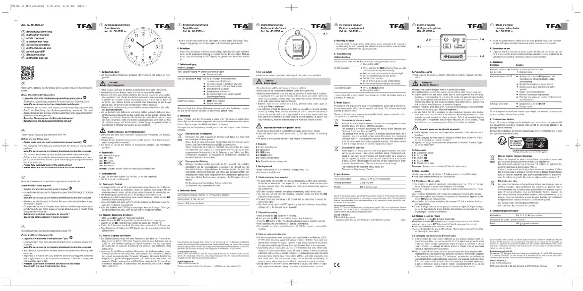 - Do not expose the device to extreme temperatures, vibrations or shocks. • Clean the device with a soft damp cloth. Do not use solvents or scouringagents. • The device is only suitable for indoor use. Protect it from moisture! 4. ElementsA 1: Wall mounting holeA 2: SET buttonA 3: REC buttonA 4: RESET buttonA 5: Battery compartment Note: Press the buttons using a pin.5. Getting started• Insert a new battery AA 1,5 V with the correct polarity (+/-).• The device is ready for use.5.1 Radio-controlled time reception• The clock hands now travel to 12 o'clock automatically and the radio-controlledclock tries to receive the radio signal for 3 - 15 minutes. When the time codehas been received after a few minutes, the clock hands automatically adjust tothe current time.• DCF radio reception attempts take place automatically up to 8 times a day. • You can also activate the DCF reception manually. Press and hold the REC button for three seconds.• The clock hands will then move to 12 o'clock and the clock tries to receive theradio signal again.• If the clock cannot detect the DCF-signal (e.g. due to interference, transmittingdistance, etc.), the time can be set manually.5.2 Manual time setting• Press and hold the SET button for 4 seconds.• Press and hold the SET button until the desired time is indicated.• Press the SET button briefly. The clock hands move forward minute by minute. • Wait 8 seconds, the unit will save the setting automatically.• The manually set time is overwritten once the DCF time signal is successfullyreceived. 5.3 Note on radio-controlled time• The time is transmitted from an atomic clock near Frankfurt am Main by a DCF-77 (77.5 kHz) frequency signal with a range of about 1,500 km. Your radio-con-trolled clock receives the signal, converts it and always shows the exact time.The adjustment of Daylight-Saving Time and Standard Time is also automatic. • Avoid being close to possible sources of interference that may affect radioreception. It is recommended to keep a distance of at least 2 metres to possiblyinterfering sources (TV, computer, microwave, wireless phones, baby monitors)and large metal objects (e.g. refrigerator). Within solid walls, especially oneswith metal parts, the transmission range can be reduced considerably. Inextreme cases, please place the unit close to a window to improve reception. • During night-time, the atmospheric interference is usually less severe. A singledaily reception is adequate to keep the accuracy deviation under 1 second.6. Mounting the clock Securely attach the device with a solid nail or a screw and dowel at the respectivelocation using the wall mounting hole. Before the final installation, make sure thatthe reception of the DCF time signal is possible.7. TroubleshootingProblem SolutionClock hands do not move ➜ Ensure that the battery polarity is correct➜ Change the battery No DCF reception ➜ Press and hold the REC button for three seconds and activate the reception manually➜ Wait for an attempt reception during the night➜ Choose another place for your device ➜ Set the clock manually➜ Check if there is any source of interference➜ Restart the device according to the manual Incorrect indication ➜ Press the RESET button ➜ Change the batteryIf your device fails to work despite these measures, contact the retailer where youpurchased the product. 8. Waste disposalThis product and its packaging have been manufactured using high-grade materi-als and components which can be recycled and reused. This reduces waste andprotects the environment. Dispose of the packaging in an environmentally friendly manner using the collec-tion systems that have been set up.Disposal of the electrical deviceRemove non-permanently installed batteries and rechargeable batteriesfrom the device and dispose of them separately.This product is labelled in accordance with the EU Waste Electrical andElectronic Equipment Directive (WEEE). This product must not be disposed of in ordinary household waste. As aconsumer, you are required to take end-of-life devices to a designatedcollection point for the disposal of electrical and electronic equipment, inorder to ensure environmentally-compatible disposal. The return serviceis free of charge. Observe the current regulations in place!Disposal of the batteries Never dispose of empty batteries and rechargeable batteries with ordi-nary household waste. They contain pollutants which, if improperly dis-posed of, can harm the environment and human health. As a consumer,you are required by law to take them to your retail store or to an appro-priate collection site depending on national or local regulations in orderto protect the environment. The return service is free of charge.The symbols for the contained heavy metals are: Cd=cadmium, Hg=mercury, Pb=lead. 9. SpecificationsPower consumption: Battery 1 x AA 1,5 V (not included) Housing dimension: Ø 245 x 42 mm Weight: 455 g (device only)No part of this manual may be reproduced without written consent of TFA Dostmann. The technicaldata are correct at the time of going to print and may change without prior notice. The latest technicaldata and information about this product can be found in our homepage by simply entering the prod-uct number in the search box. EU Declaration of conformity Hereby, TFA Dostmann declares that the radio equipment type 60.3550 is in compliance with Directive2014/53/EU. The full text of the EU declaration of conformity is available at the following internetaddress: www.tfa-dostmann.de/service/downloads/cewww.tfa-dostmann.deE-Mail: info@tfa-dostmann.deTFA Dostmann GmbH & Co.KG, Zum Ottersberg 12, 97877 Wertheim, Germany 05/231. Pour votre sécurité• Vous ne devez en aucun cas réparer, démonter ou modifier l'appareil par vous-même.Attention ! Danger de blessure :