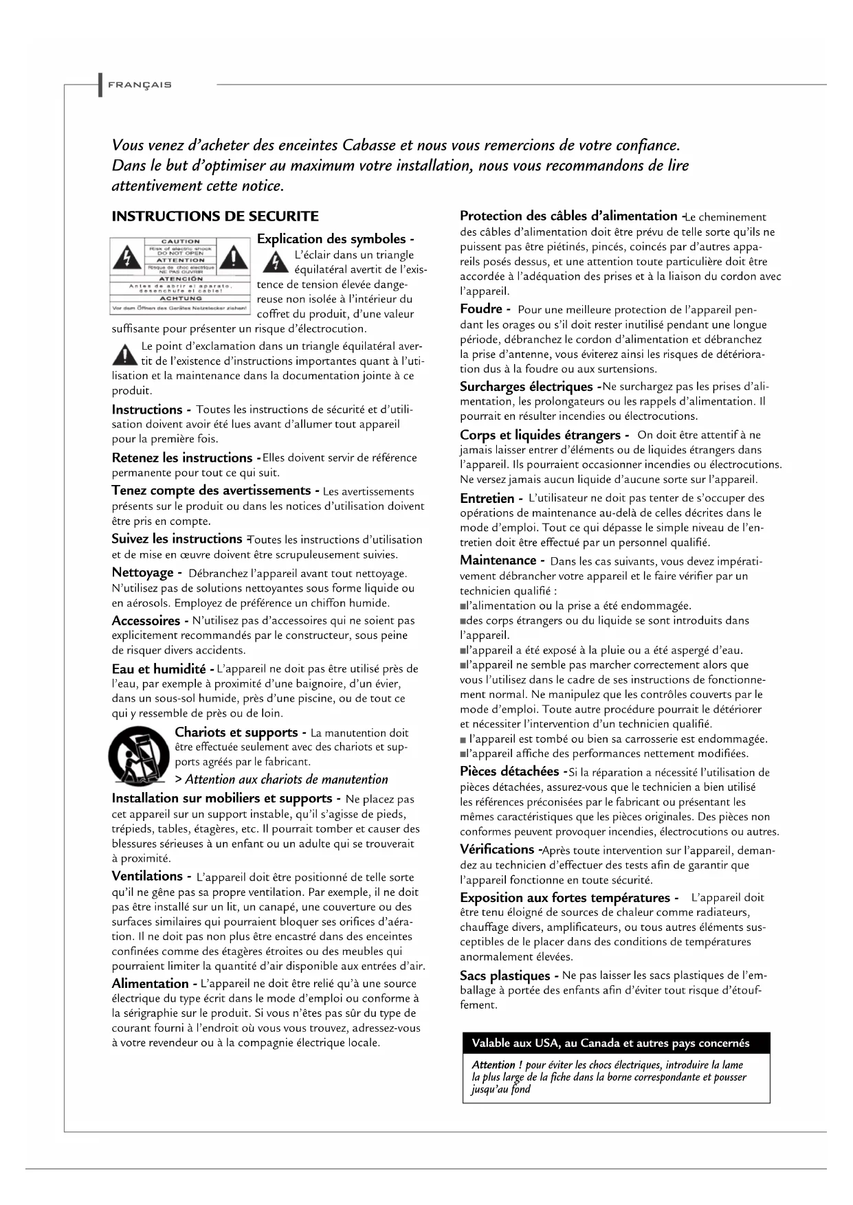 Explication des symboles - L’éclair dans un triangle équilatéral avertit de l’exis- tence de tension élevée dange- reuse non isolée à l’intérieur du coffret du produit, d’une valeur suffisante pour présenter un risque d’électrocution. Le point d’exclamation dans un triangle équilatéral aver- tit de l’existence d’instructions importantes quant à l’uti- lisation et la maintenance dans la documentation jointe à ce produit. Instructions - Toutes les instructions de sécurité et d’utili- sation doivent avoir été lues avant d’allumer tout appareil pour la première fois. Retenez les instructions - Elles doivent servir de référence permanente pour tout ce qui suit. Tenez compte des avertissements - Les avertissements présents sur le produit ou dans les notices d’utilisation doivent être pris en compte. Suivez les instructions - Toutes les instructions d’utilisation et de mise en œuvre doivent être scrupuleusement suivies. Nettoyage - Débranchez l’appareil avant tout nettoyage. N’utilisez pas de solutions nettoyantes sous forme liquide ou en aérosols. Employez de préférence un chiffon humide. Accessoires - N’utilisez pas d’accessoires qui ne soient pas explicitement recommandés par le constructeur, sous peine de risquer divers accidents. Eau et humidité - L’appareil ne doit pas être utilisé près de l’eau, par exemple à proximité d’une baignoire, d’un évier, dans un sous-sol humide, près d’une piscine, ou de tout ce qui y ressemble de près ou de loin. Chariots et supports - La manutention doit être effectuée seulement avec des chariots et sup- ports agréés par le fabricant. > Attention aux chariots de manutention Installation sur mobiliers et supports - Ne placez pas cet appareil sur un support instable, qu’il s’agisse de pieds, trépieds, tables, étagères, etc. Il pourrait tomber et causer des blessures sérieuses à un enfant ou un adulte qui se trouverait à proximité. Ventilations - L’appareil doit être positionné de telle sorte qu’il ne gêne pas sa propre ventilation. Par exemple, il ne doit pas être installé sur un lit, un canapé, une couverture ou des surfaces similaires qui pourraient bloquer ses orifices d’aéra- tion. Il ne doit pas non plus être encastré dans des enceintes confinées comme des étagères étroites ou des meubles qui pourraient limiter la quantité d’air disponible aux entrées d’air. Alimentation - L’appareil ne doit être relié qu’à une source électrique du type écrit dans le mode d’emploi ou conforme à la sérigraphie sur le produit. Si vous n’êtes pas sûr du type de courant fourni à l’endroit où vous vous trouvez, adressez-vous à votre revendeur ou à la compagnie électrique locale. Protection des câbles d’alimentation - Le cheminement des câbles d’alimentation doit être prévu de telle sorte qu’ils ne puissent pas être piétinés, pincés, coincés par d’autres appa- reils posés dessus, et une attention toute particulière doit être accordée à l’adéquation des prises et à la liaison du cordon avec l’appareil. Foudre - Pour une meilleure protection de l’appareil pen- dant les orages ou s’il doit rester inutilisé pendant une longue période, débranchez le cordon d’alimentation et débranchez la prise d’antenne, vous éviterez ainsi les risques de détériora- tion dus à la foudre ou aux surtensions. Surcharges électriques - Ne surchargez pas les prises d’ali- mentation, les prolongateurs ou les rappels d’alimentation. Il pourrait en résulter incendies ou électrocutions. Corps et liquides étrangers - On doit être attentif à ne jamais laisser entrer d’éléments ou de liquides étrangers dans l’appareil. Ils pourraient occasionner incendies ou électrocutions. Ne versez jamais aucun liquide d’aucune sorte sur l’appareil. Entretien - L’utilisateur ne doit pas tenter de s’occuper des opérations de maintenance au-delà de celles décrites dans le mode d’emploi. Tout ce qui dépasse le simple niveau de l’en- tretien doit être effectué par un personnel qualifié. Maintenance - Dans les cas suivants, vous devez impérati- vement débrancher votre appareil et le faire vérifier par un technicien qualifié : n l’alimentation ou la prise a été endommagée.n des corps étrangers ou du liquide se sont introduits dans l’appareil. n l’appareil a été exposé à la pluie ou a été aspergé d’eau.n l’appareil ne semble pas marcher correctement alors que vous l’utilisez dans le cadre de ses instructions de fonctionne- ment normal. Ne manipulez que les contrôles couverts par le mode d’emploi. Toute autre procédure pourrait le détériorer et nécessiter l’intervention d’un technicien qualifié.