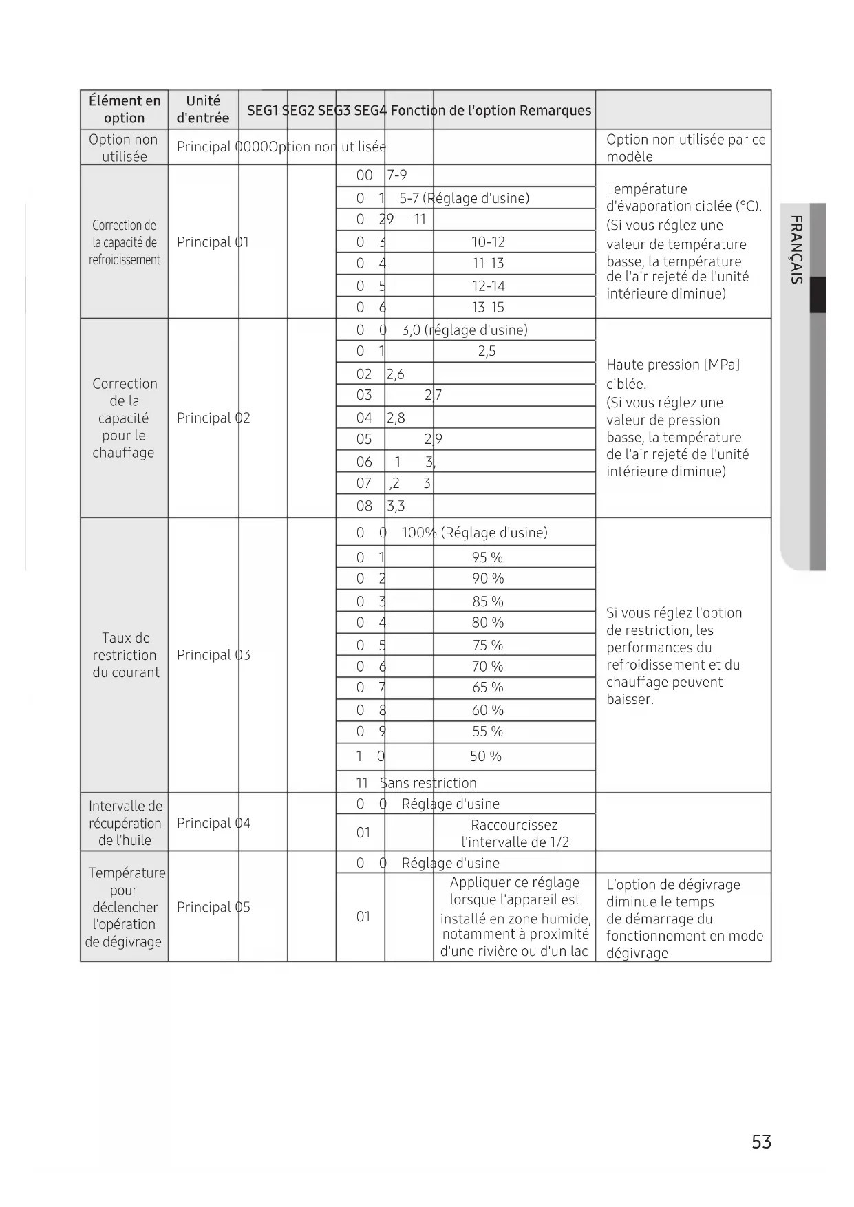 Taux de restriction du courant Principal ߢߥ ߢ ߢ ߣߢߢ࣑ŵʭ˝ɇ˝ʪʒЇϑʪ࣒ ƊЭͱЇϑθʭ˝ʪіͱΧϩͱ de restriction, les performances du refroidissement et du chauffage peuvent baisser.