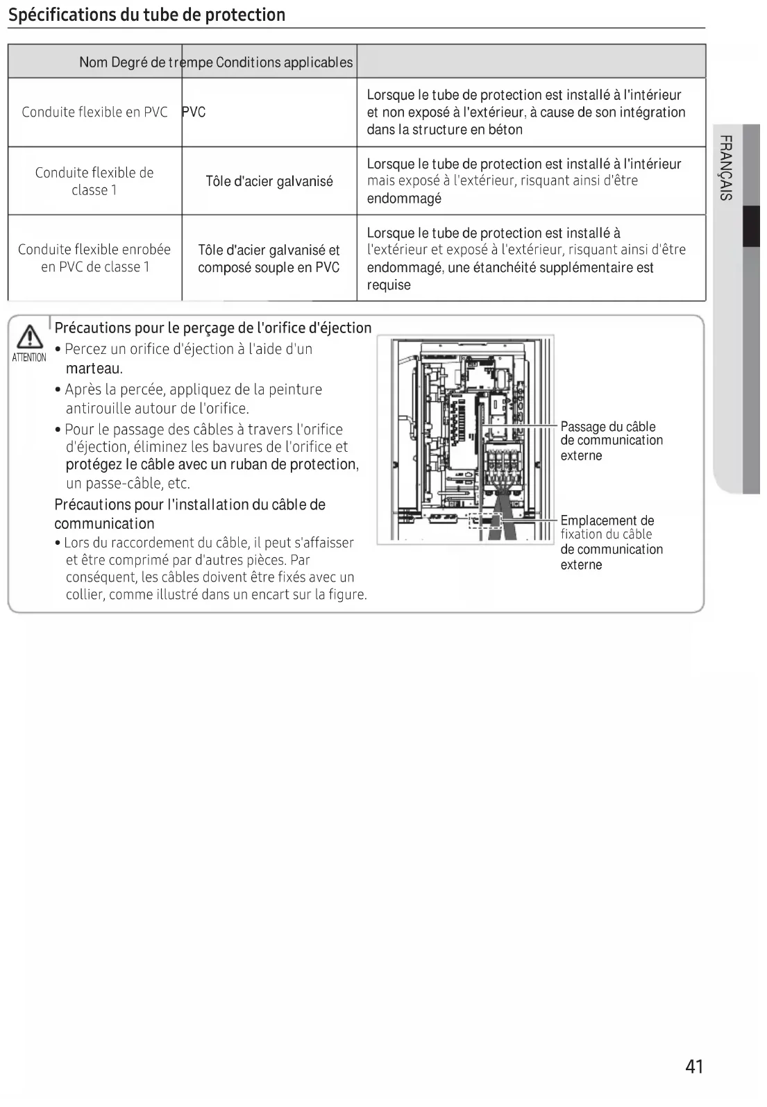 øʪϑʀͱθʒͱϑʒɇʪϩɇϩͱʒʪϑΧʽʀʪϑʒɇΧΧɇθʪϑʒʪϑϩʭϑɞЇʪЇϩϑɇϩͱʪуϩʭθʪЇθʪʪʒͱЭʪϩΧɇϑ ʲϩθʪΧЇϑʭ˝ʪθϑαЇʪʪʀͱθʒͱѤʪуɵʪ˝ɇʭʒʪΧͱцʀ˵ͱθͱΧθʽʪ࣑Uʭϑ˝ɇϩͱʒЇʀͱʒʪÃkAࡤߨߢߤߦߧÃkAߨߨࢩ AkĘkøkAࡤ²ߢߩŵĘ࣒ࣛߦߣ FRANÇAIS ƊΧʭʀѣʀɇϩͱϑʒЇϩЇɵʪʒʪΧθͱϩʪʀϩͱ Nom Degré de trempe Conditions applicables AͱʒЇϩʪѤʪуɵʪʪťǤA PVC Lorsque le tube de protection est installé à l'intérieur et non exposé à l'extérieur, à cause de son intégration dans la structure en béton AͱʒЇϩʪѤʪуɵʪʒʪ ʀɇϑϑʪߣ Tôle d'acier galvanisé Lorsque le tube de protection est installé à l'intérieur ɇϑʪуΧͱϑʭɞʪуϩʭθʪЇθࡥθϑαЇɇϩɇϑʒʲϩθʪ endommagé AͱʒЇϩʪѤʪуɵʪʪθͱɵʭʪ ʪťǤAʒʪʀɇϑϑʪߣ Tôle d'acier galvanisé et composé souple en PVC Lorsque le tube de protection est installé à ʪуϩʭθʪЇθʪϩʪуΧͱϑʭɞʪуϩʭθʪЇθࡥθϑαЇɇϩɇϑʒʲϩθʪ endommagé, une étanchéité supplémentaire est requise ťθʭʀɇЇϩͱϑΧͱЇθʪΧʪθʅɇ˝ʪʒʪͱθѣʀʪʒʭʪʀϩͱ ࡛ťʪθʀʪіЇͱθѣʀʪʒʭʪʀϩͱɞɇʒʪʒЇ marteau. ࡛ΧθʽϑɇΧʪθʀʭʪࡥɇΧΧαЇʪіʒʪɇΧʪϩЇθʪ ɇϩθͱЇʪɇЇϩͱЇθʒʪͱθѣʀʪ ࡛ťͱЇθʪΧɇϑϑɇ˝ʪʒʪϑʀɑɵʪϑɞϩθɇЭʪθϑͱθѣʀʪ ʒʭʪʀϩͱࡥʭʪіʪϑɵɇЭЇθʪϑʒʪͱθѣʀʪʪϩ protégez le câble avec un ruban de protection, ЇΧɇϑϑʪࣛʀɑɵʪࡥʪϩʀ Précautions pour l'installation du câble de communication ࡛øͱθϑʒЇθɇʀʀͱθʒʪʪϩʒЇʀɑɵʪࡥΧʪЇϩϑɇ˙˙ɇϑϑʪθ ʪϩʲϩθʪʀͱΧθʭΧɇθʒɇЇϩθʪϑΧʽʀʪϑťɇθ ʀͱϑʭαЇʪϩࡥʪϑʀɑɵʪϑʒͱЭʪϩʲϩθʪѣуʭϑɇЭʪʀЇ ʀͱʪθࡥʀͱʪЇϑϩθʭʒɇϑЇʪʀɇθϩϑЇθɇѣ˝Їθʪ Passage du câble de communication externe Emplacement de ѣуɇϩͱʒЇʀɑɵʪ de communication externe ATTENTIONߦߤ Travail de câblage électrique Schéma du câblage d'alimentation ʪϩɇϩͱɞߥΧ˵ɇϑʪϑʪϩߦʀͱʒЇʀϩʪЇθϑ࣑ߥߪߢࣛߦߣߧǤ࣒ øͱθϑαЇʪɇʀͱɵɇϑͱʒЇϩʭϑѣ˝ЇθʪʒɇϑʪϑϩɇɵʪɇЇуʒʪɇϑʪʀϩͱࣥAͱɵɇϑͱʒЇϩʭϑʪуϩʭθʪЇθʪϑࣦ ߥΧ˵ɇϑʪϑߦʀͱʒЇʀϩʪЇθϑ ࣑ߥߪߢࣛߦߣߧǤ࣒ MCCB+ ELB MCCB+ ELB ELCB ELCB Unité principale Unité principale ƊͱЇϑࣛЇϩʭ ƊͱЇϑࣛЇϩʭ Unité principale ƊͱЇϑࣛЇϩʭߣ ƊͱЇϑࣛ
