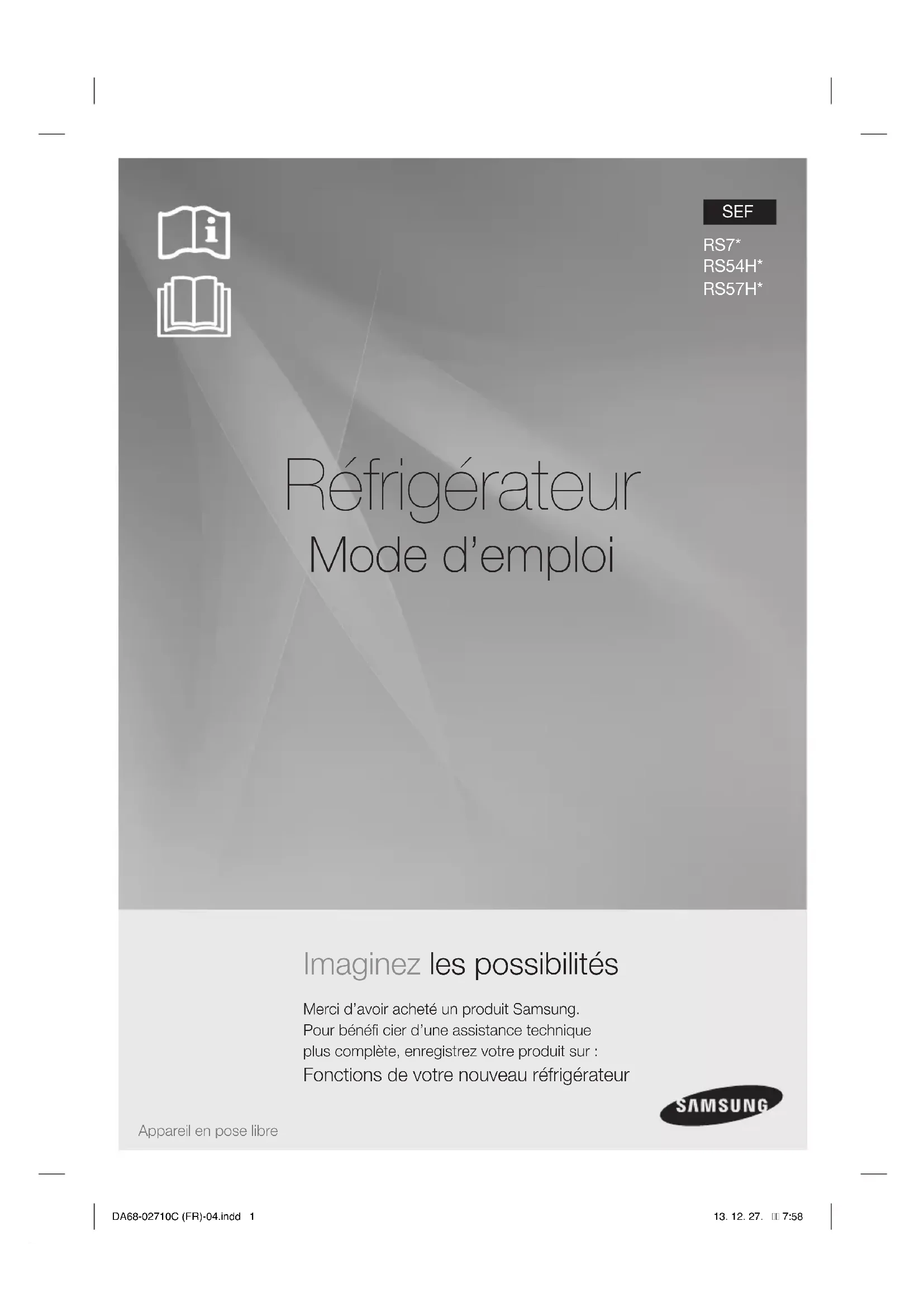 Réfrigérateur Mode d’emploi Imaginez les possibilités Merci d’avoir acheté un produit Samsung.Pour bénéfi cier d’une assistance techniqueplus complète, enregistrez votre produit sur : Fonctions de votre nouveau réfrigérateur Appareil en pose libre SEF RS7* RS54H* RS57H* DA68-02710C (FR)-04.indd 1DA68-02710C (FR)-04.indd 1 13. 12. 27. 7:5813. 12. 27. 7:58Français - 2