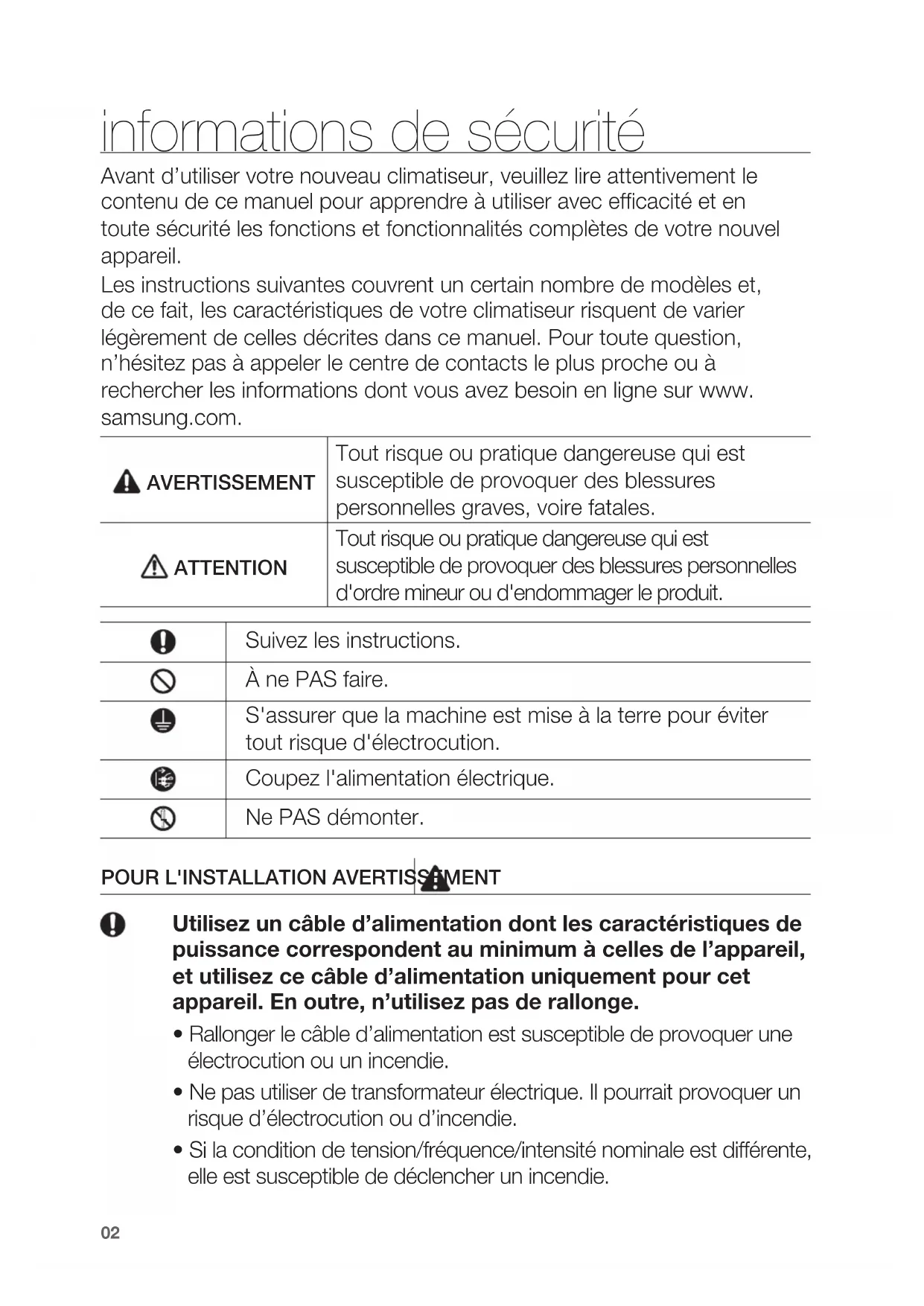 informations de sécurité Avant d’utiliser votre nouveau climatiseur, veuillez lire attentivement le contenu de ce manuel pour apprendre à utiliser avec efficacité et en toute sécurité les fonctions et fonctionnalités complètes de votre nouvel appareil. Les instructions suivantes couvrent un certain nombre de modèles et, de ce fait, les caractéristiques de votre climatiseur risquent de varier légèrement de celles décrites dans ce manuel. Pour toute question, n’hésitez pas à appeler le centre de contacts le plus proche ou à rechercher les informations dont vous avez besoin en ligne sur www. samsung.com. AVERTISSEMENT Tout risque ou pratique dangereuse qui est susceptible de provoquer des blessures personnelles graves, voire fatales. ATTENTION Tout risque ou pratique dangereuse qui est susceptible de provoquer des blessures personnelles d'ordre mineur ou d'endommager le produit. Suivez les instructions. À ne PAS faire. S'assurer que la machine est mise à la terre pour éviter tout risque d'électrocution. Coupez l'alimentation électrique. Ne PAS démonter.