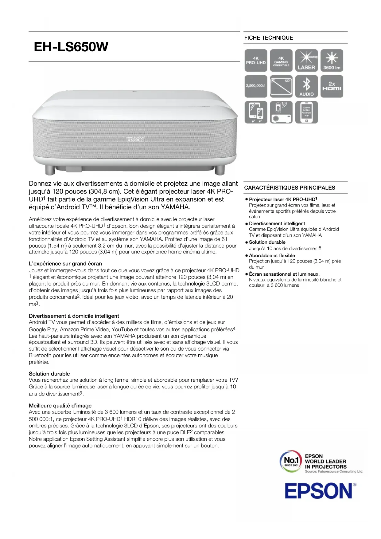EH-LS650W FICHE TECHNIQUE Donnez vie aux divertissements à domicile et projetez une image allant jusqu’à 120 pouces (304,8 cm). Cet élégant projecteur laser 4K PRO- UHD