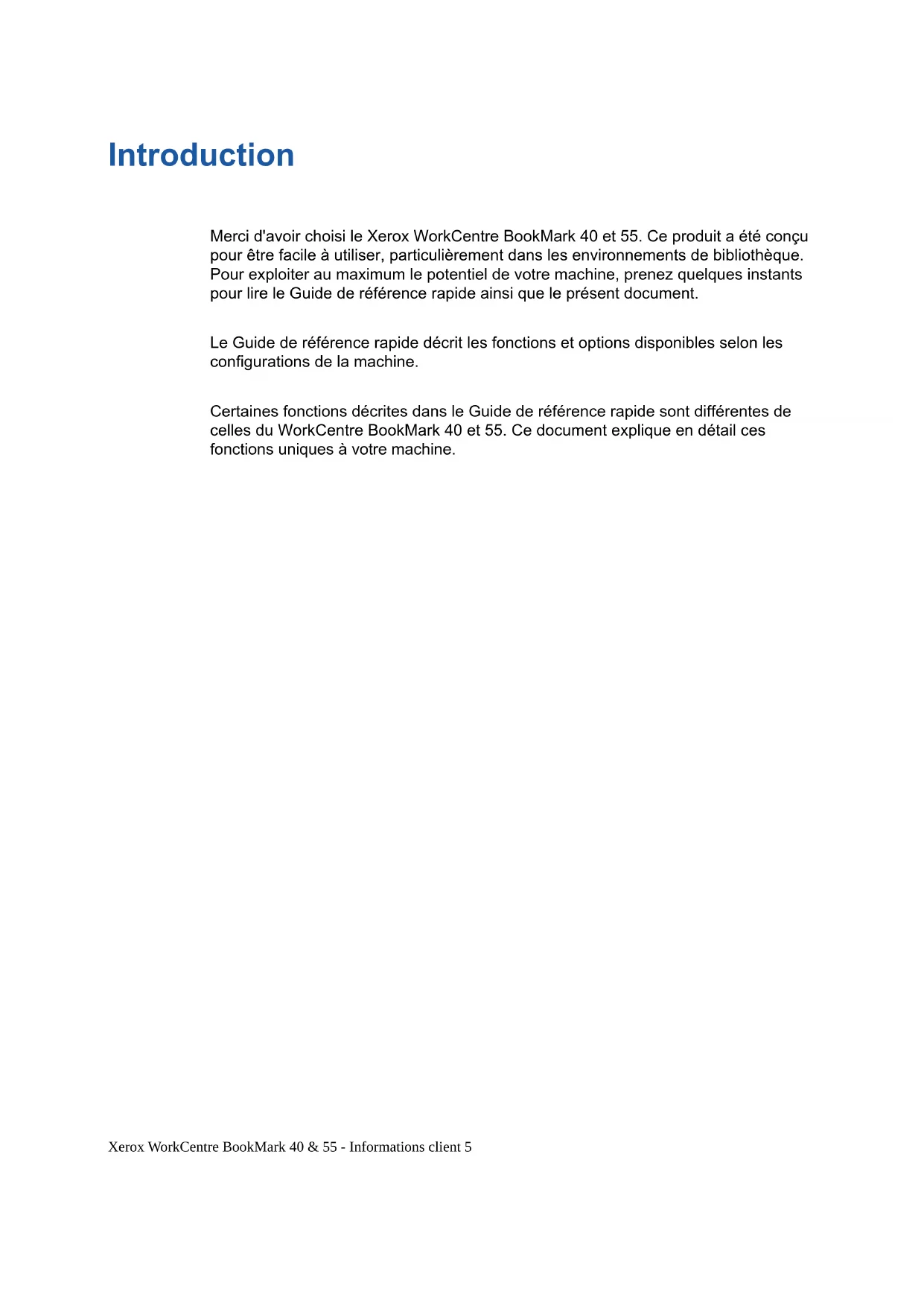 , and all Xerox products mentioned in this publication are trademarks of Xerox Corporation. Product names and trademarks of other companies are hereby acknowledged. Changes, technical inaccuracies and typographical errors will be corrected in subsequent editions. Version 1.0 - 7.2.08 Part Number: 604E43390Xerox WorkCentre BookMark 40 & 55 Customer Supplement 1 Introduction Thank you for choosing the Xerox WorkCentre BookMark 40 and 55. This product has been designed for ease of use, particularly in library environments. To use your machine to the it's fullest potential, take some ti me to read the Quick Reference Guide and this document. The Quick Reference Guide provides an overview of the features and options that may be available on your machine. Some features mentioned in the Quick Reference Guide are different for the WorkCentre BookMark 40 and 55. This document details the unique features of your machine.2 Xerox WorkCentre BookMark 40 & 55 Customer Supplement Copying a Book Align the book to the arrow at the top left of the document glass as shown in the picture. The Basic Copying tab is the default Copy screen. Select the Copy buttons on the Basic Copying tab as described in the User Guide to select the required copy features such as background suppression and contrast.Xerox WorkCentre BookMark 40 & 55 Customer Supplement 3 Copying a Document Align the document page to the arrow at the top left of the document glass as shown in the picture. The Basic Copying tab is the default Copy screen. Select the Copy buttons on the Basic Copying tab as described in the User Guide to select the required copy features such as background suppression and contrast.4 Xerox WorkCentre BookMark 40 & 55 Customer SupplementXerox WorkCentre BookMark 40 & 55 - Informations client 5 Introduction Merci d'avoir choisi le Xerox WorkCentre BookMark 40 et 55. Ce produit a été conçu pour être facile à utiliser, particulièrement dans les environnements de bibliothèque. Pour exploiter au maximum le potentiel de votre machine, prenez quelques instants pour lire le Guide de référence rapide ainsi que le présent document. Le Guide de référence rapide décrit les fonctions et options disponibles selon les configurations de la machine. Certaines fonctions décrites dans le Guide de référence rapide sont différentes de celles du WorkCentre BookMark 40 et 55. Ce document explique en détail ces fonctions uniques à votre machine.6 Xerox WorkCentre BookMark 40 & 55 - Informations client Copie d'un livre Alignez le livre sur la flèche située dans le coin supérieur gauche de la glace d'exposition comme illustré ici. L'onglet Tirage standard est l'écran de copie par défaut. Sélectionnez les boutons de copie appropriés sur l'onglet Tirage standard comme décrit dans le Guide de l'utilisateur pour choisir les options de copie à appliquer, telles que la suppression de fond ou le contraste.Xerox WorkCentre BookMark 40 & 55 - Informations client 7 Copie d'un document Alignez la page du document sur la flèche située dans le coin supérieur gauche de la glace d'exposition comme illustré ici. L'onglet Tirage standard est l'écran de copie par défaut. Sélectionnez les boutons de copie appropriés sur l'onglet Tirage standard comme décrit dans le Guide de l'utilisateur pour choisir les options de copie à appliquer, telles que la suppression de fond ou le contraste.8 Xerox WorkCentre BookMark 40 & 55 - Informations client