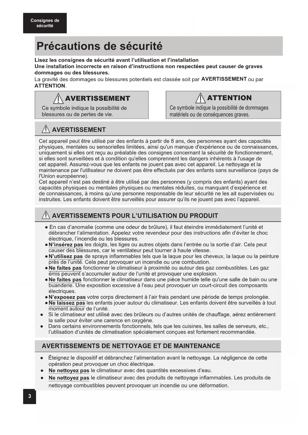 Vérication des fuites de gaz et d’électricité ……………………… 34 Fonctionnement d’essai ……………………………………………… 35 Emballage et déballage de l’unité …………………………………… 363 Consignes de sécurité Précautions de sécurité Lisez les consignes de sécurité avant l’utilisation et l’installation Une installation incorrecte en raison d’instructions non respectées peut causer de graves dommages ou des blessures. La gravité des dommages ou blessures potentiels est classée soit par AVERTISSEMENT ou par ATTENTION
