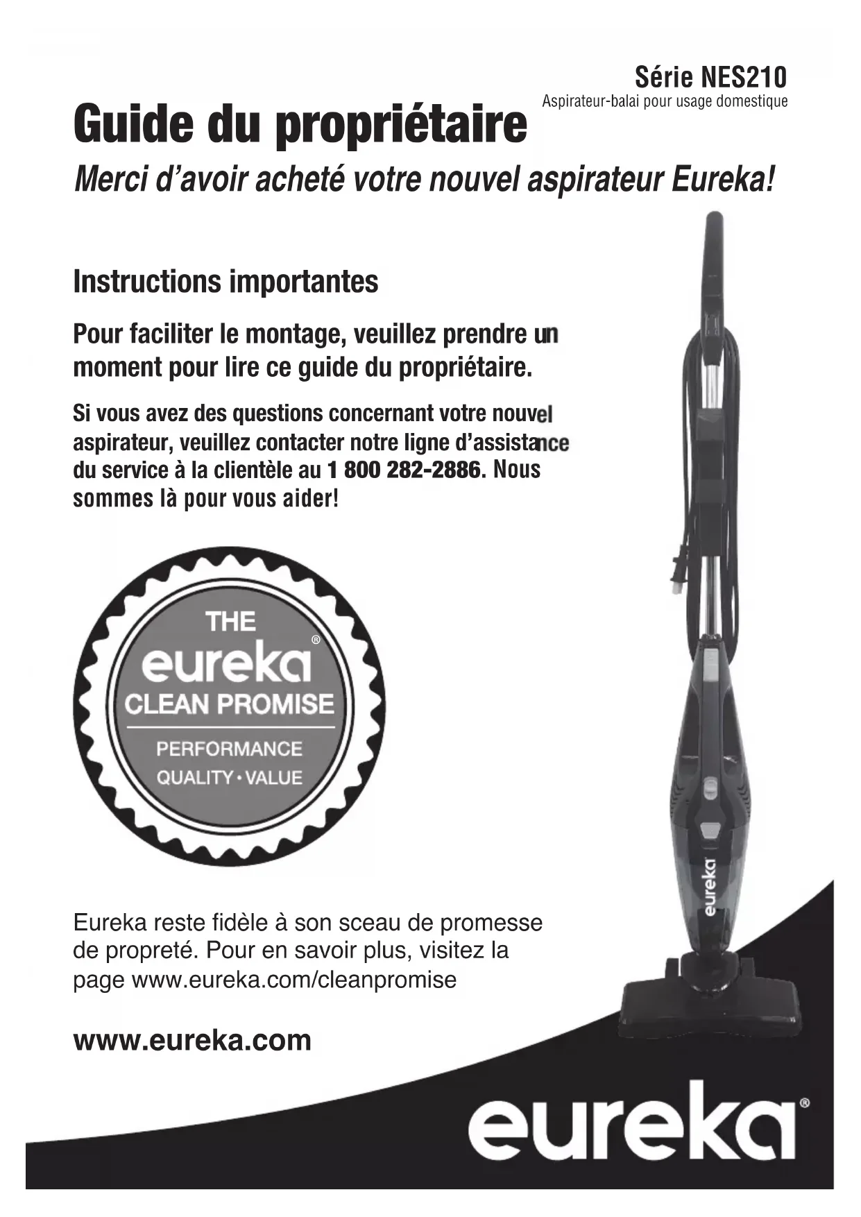 - www.eureka.com Eureka stands by our Clean Promise seal. Learn more at www.eureka.com/cleanpromise © 2020 Media America (Canada) Corp.® Merci d’avoir acheté votre nouvel aspirateur Eureka! Instructions importantes Pour faciliter le montage, veuillez prendre un moment pour lire ce guide du propriétaire. Si vous avez des questions concernant votre nouvel aspirateur, veuillez contacter notre ligne d’assistance du service à la clientèle au 1 800 282-2886. Nous sommes là pour vous aider!Eureka reste dèle à son sceau de promesse de propreté. Pour en savoir plus, visitez la page www.eureka.com/cleanpromise www.eureka.com Guide du propriétaire Série NES210 Aspirateur-balai pour usage domestique2 Ligne d’assistance du service à la clientèle d’Eureka 1 800 282-2886 Table des matières Mesures de sécurité importantes p. 3