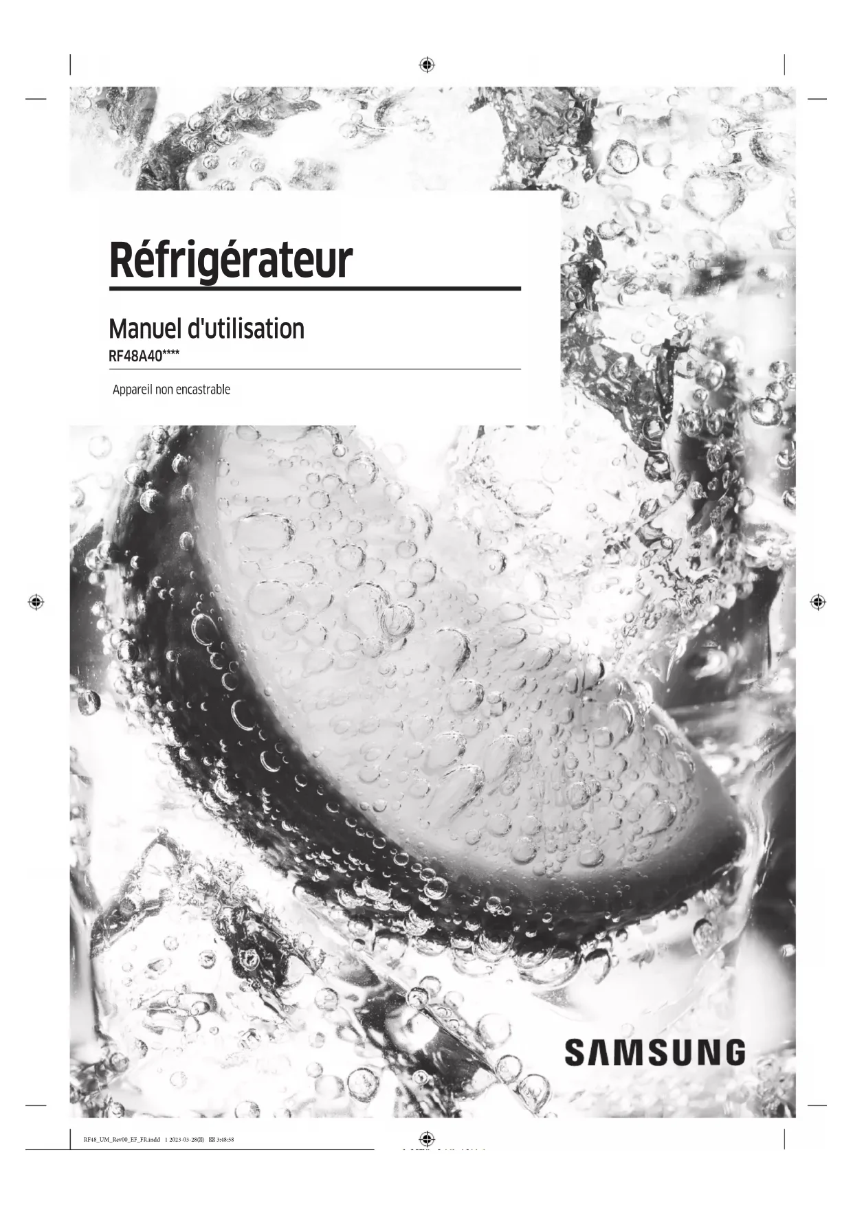 Réfrigérateur Manuel d'utilisation RF48A40**** Appareil non encastrable RF48_UM_Rev00_EF_FR.indd 1 2023-03-28() 3:48:58Sommaire Français2 Sommaire Consignes de sécurité 4 Ce que vous devez savoir concernant les consignes de sécurité 4 Consignes et symboles de sécurité importants : 6 Consignes importantes de sécurité 7 Symboles d’avertissement importants concernant le transport et le lieu d’installation de l’appareil 10 Avertissements importants concernant l’installation 11 Consignes d’installation 14 Avertissements importants concernant l’utilisation 15 Consignes d’utilisation 20 Consignes de nettoyage 23 Avertissements importants concernant la mise au rebut 25 Conseils complémentaires pour une utilisation appropriée 26 Instructions concernant la règlementation DEEE 27 Installation 28 Présentation rapide du réfrigérateur 28 Retrait des portes pour passer l'entrée 31 Installation étape par étape 38 Opérations 44 Panneau de commande 44 Fonctions spéciales 48 Entretien 52 Manipulation et entretien 52 Nettoyage 54 Remplacement 54 Dépannage 55 Généralités 55 Entendez-vous des sons anormaux provenant du réfrigérateur ? 57 RF48_UM_Rev00_EF_FR.indd 2 2023-03-28() 3:48:58Sommaire Français 3